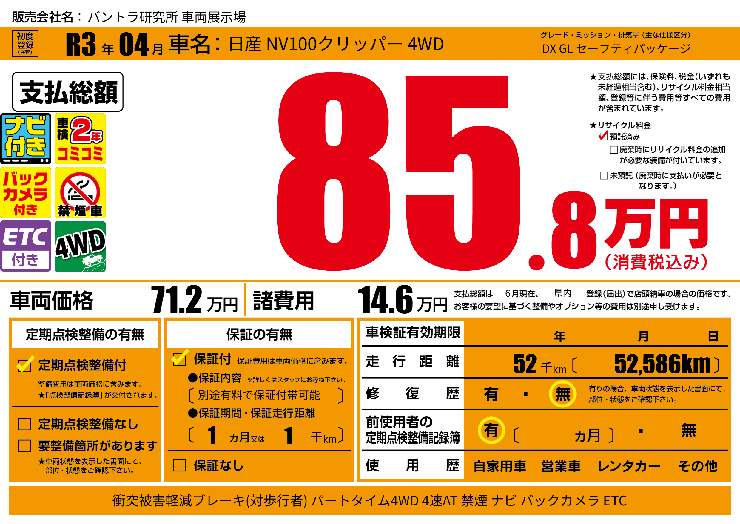 | 車名 | 日産 NV100クリッパー 4WD | グレード ミッション 排気量 |