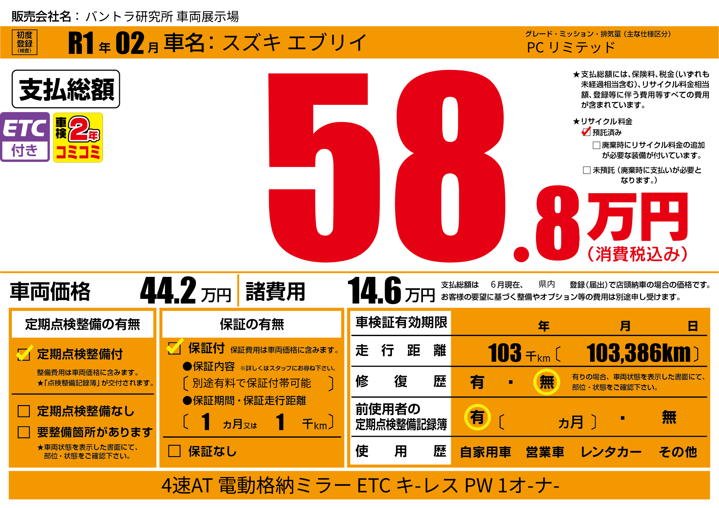 | 車名 | スズキ エブリイ | グレード ミッション 排気量 |