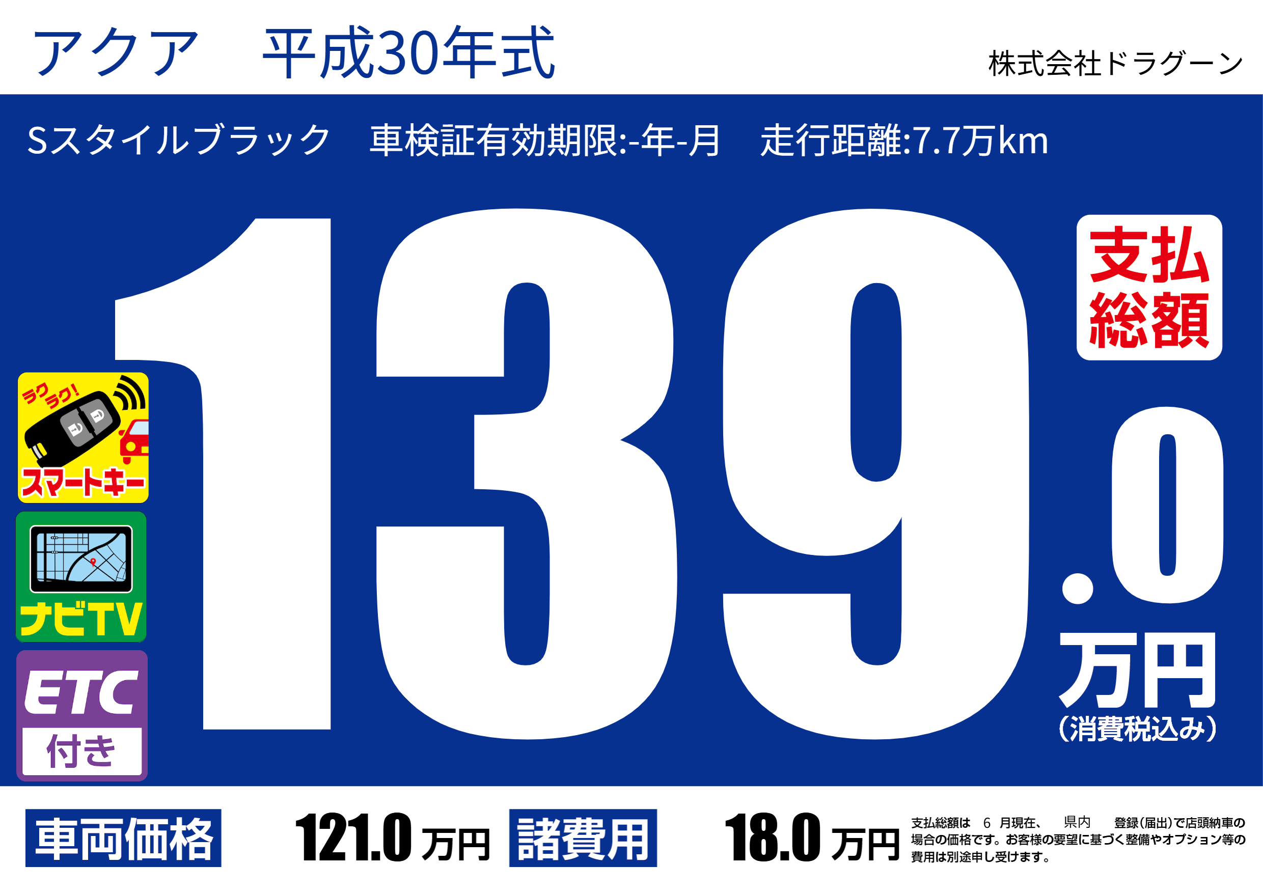 | 車名 | アクア 平成30年式 | グレード ミッション 排気量 |