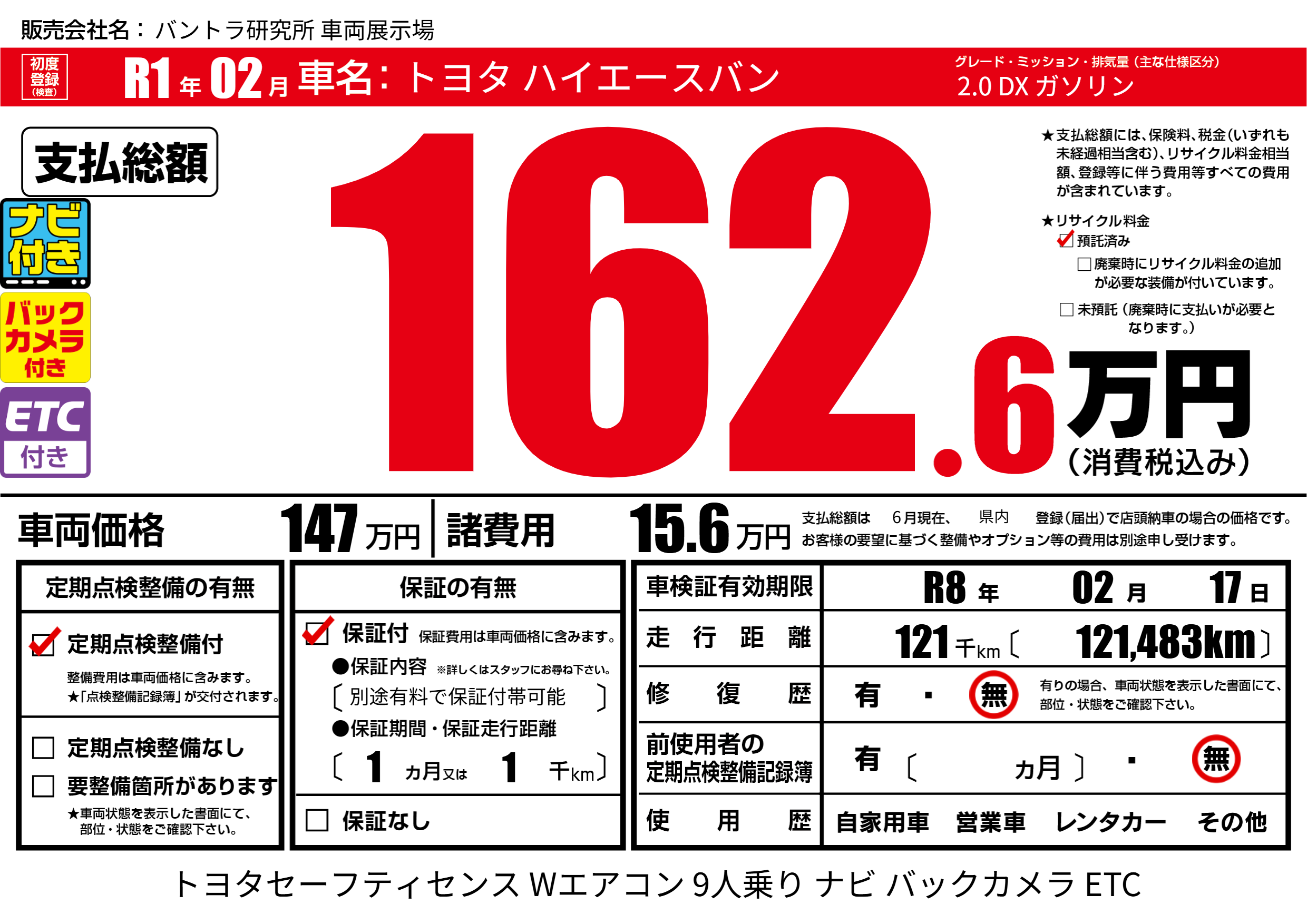 | 車名 | トヨタ ハイエースバン | グレード ミッション 排気量 |