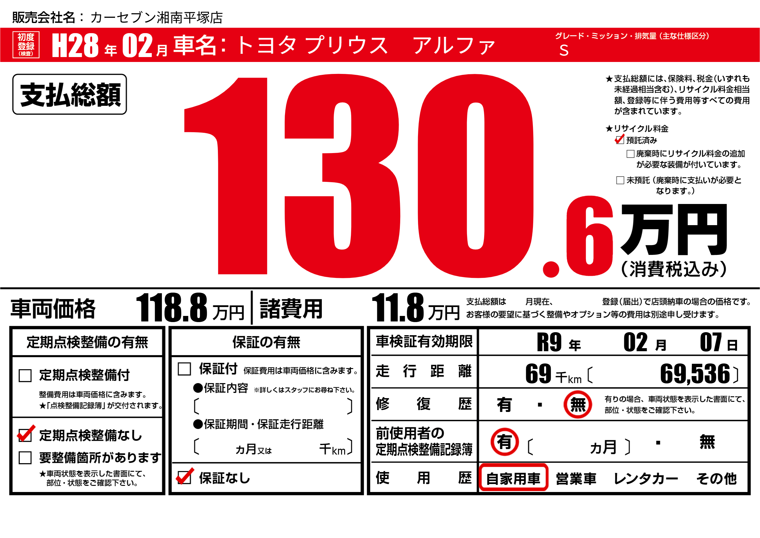 | 走行キロ | 6.9万km | 初年度登録 | H28年02月 |