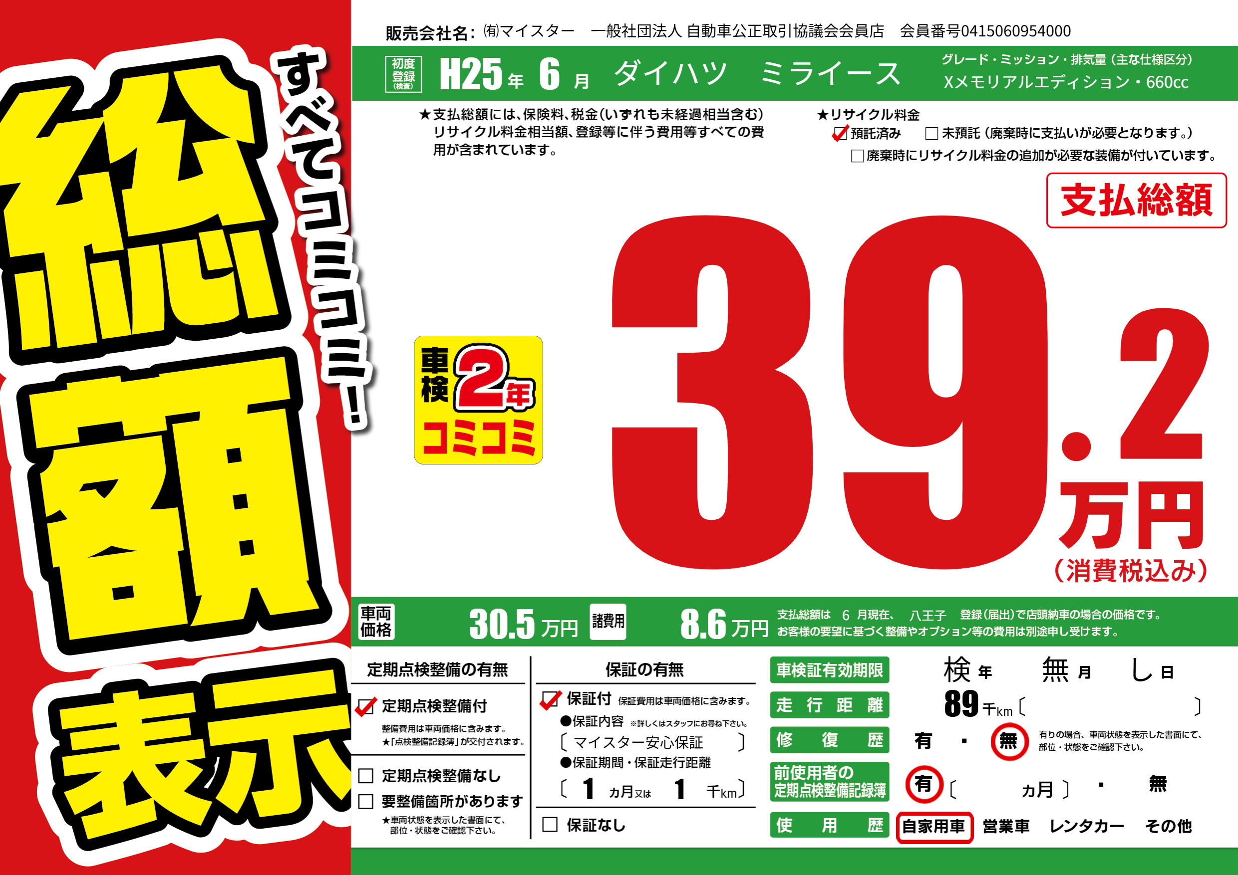 | 走行キロ | 8.9万km | 初年度登録 | H25年6月 |