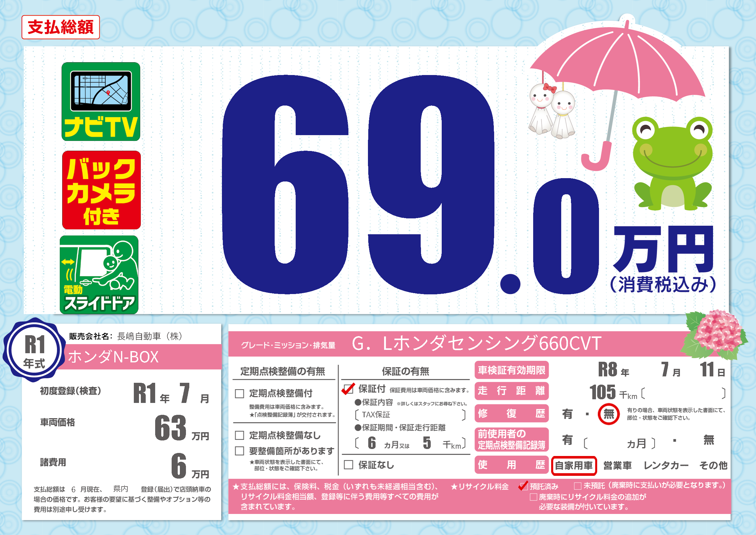 | 車名 | ホンダN-BOX | グレード ミッション 排気量 |