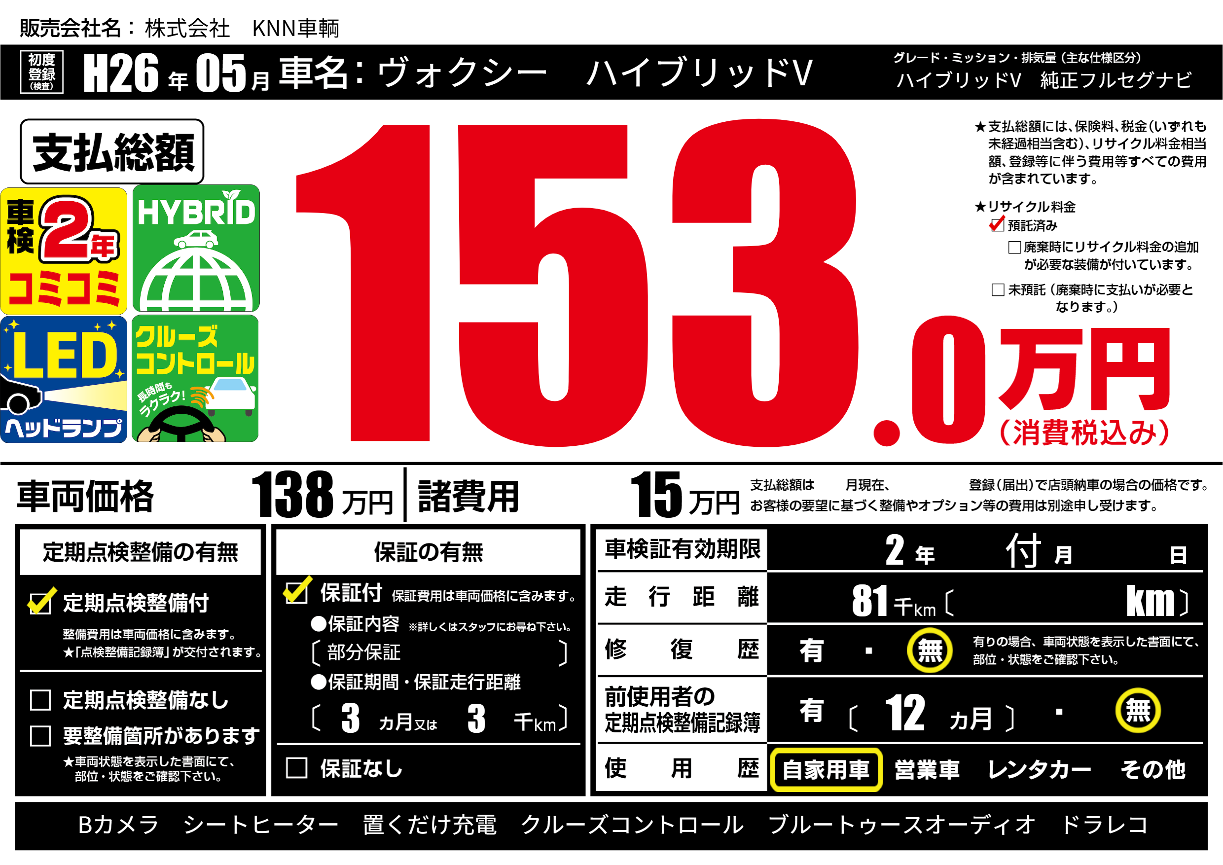 | 走行キロ | 8.1万km | 初年度登録 | H26年05月 |