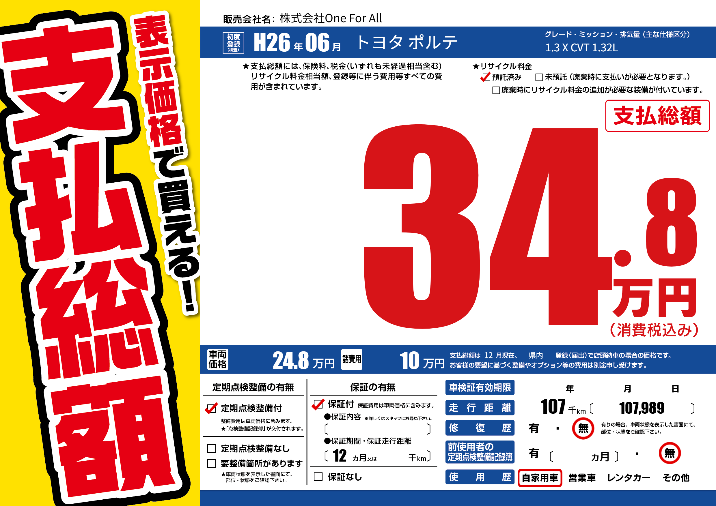 | 車名 | トヨタ ポルテ | グレード ミッション 排気量 |