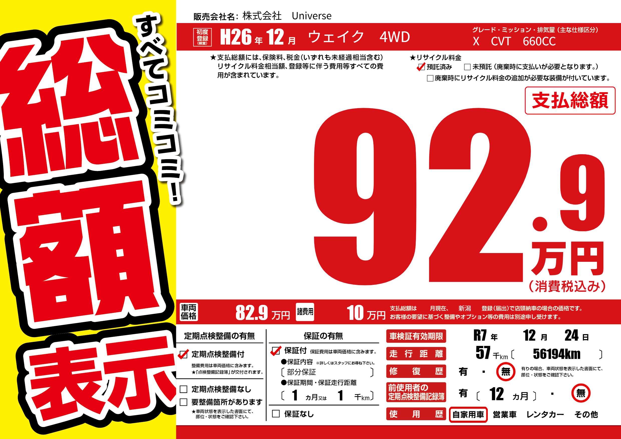 | 車名 | ウェイク 4WD | グレード ミッション 排気量 |