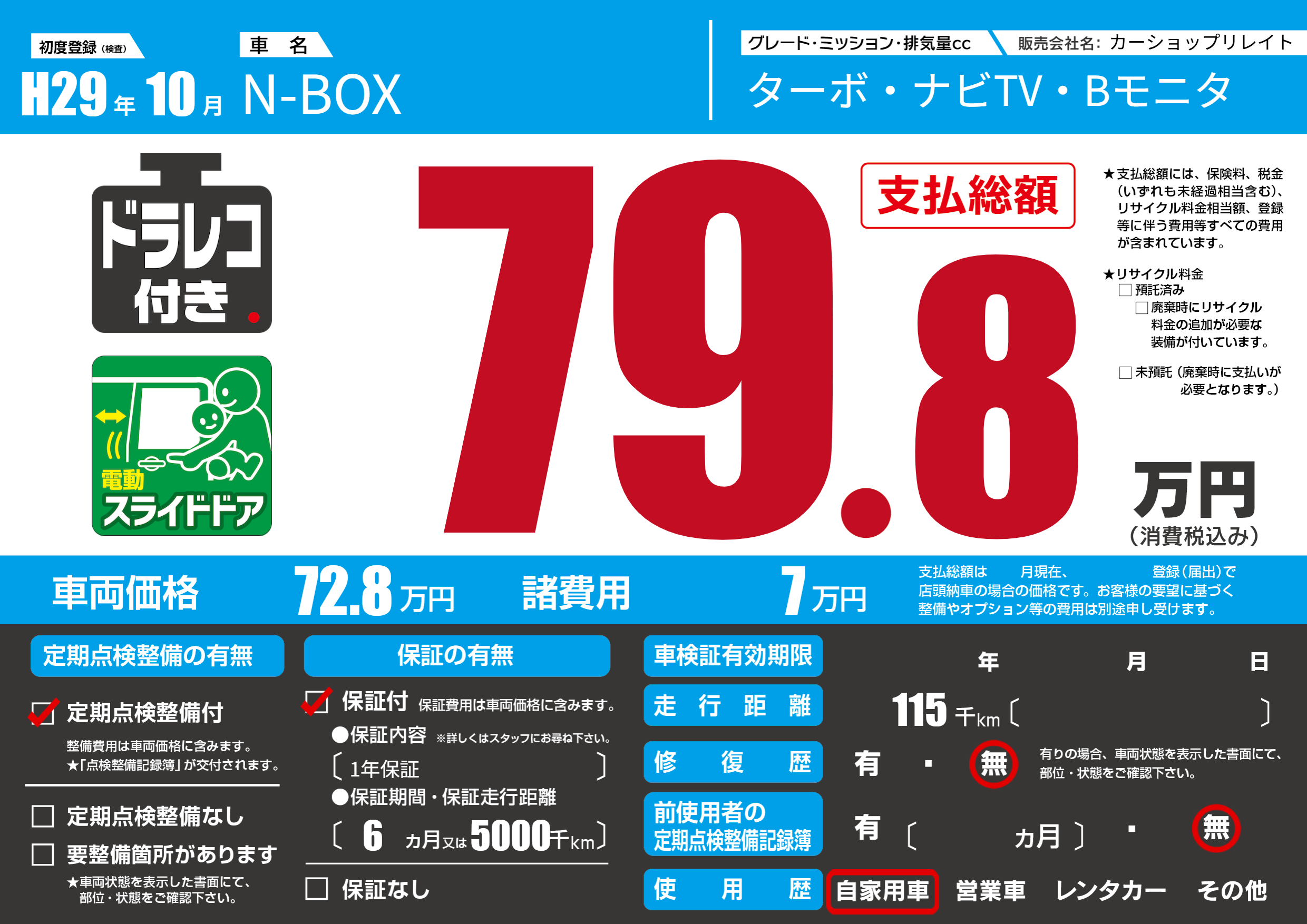 | 走行キロ | 11.5万km | 初年度登録 | H29年10月 |
