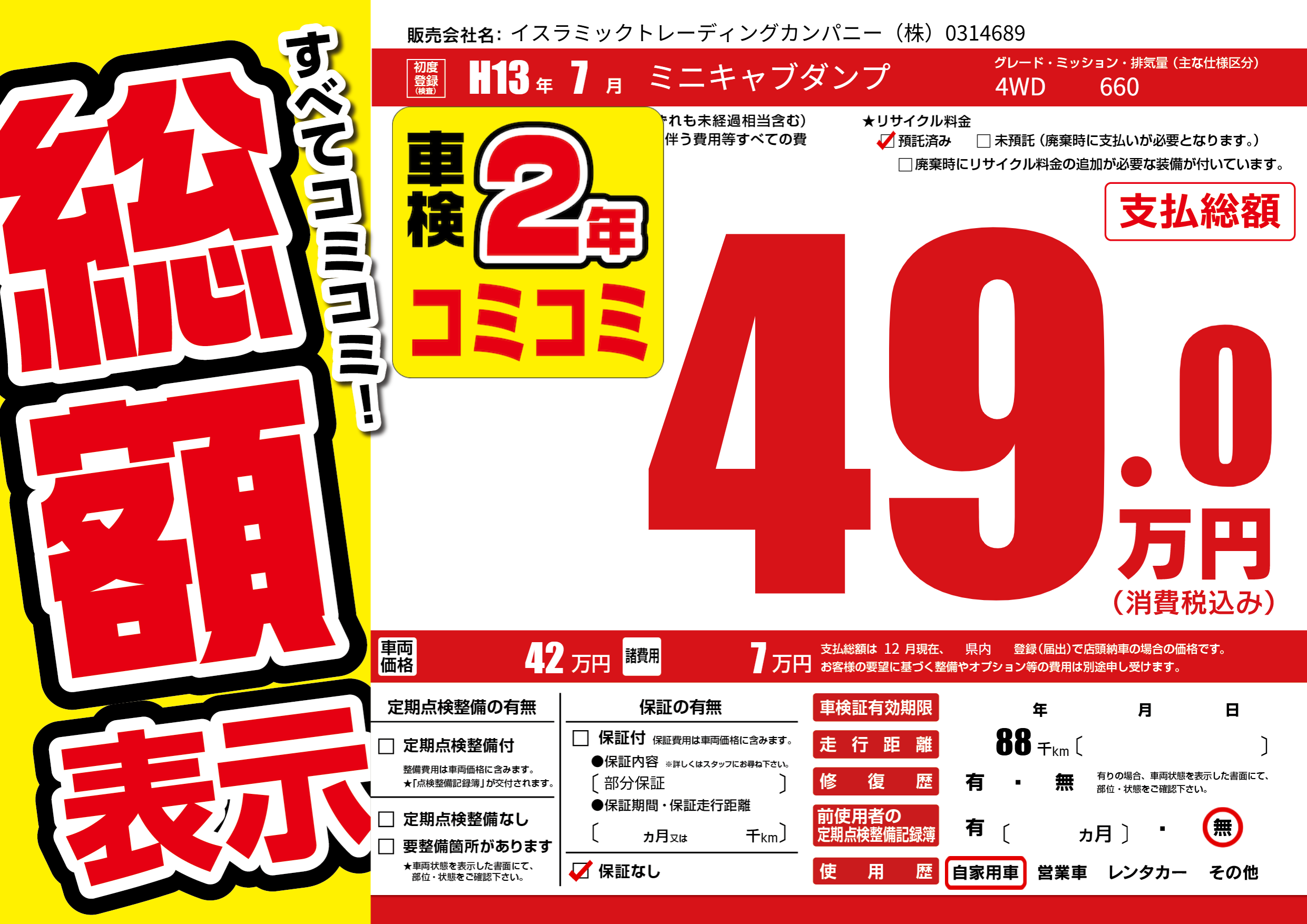 | 走行キロ | 8.8万km | 初年度登録 | H13年7月 |