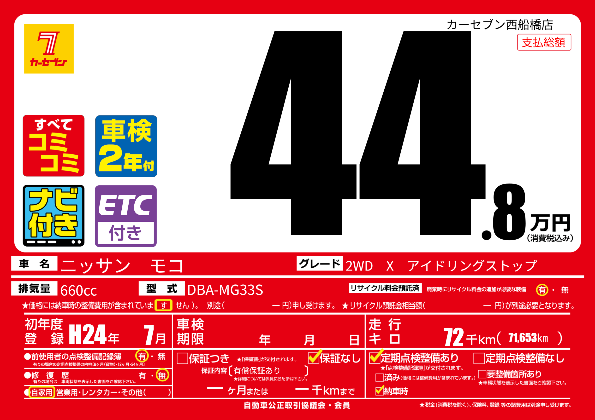 | 走行キロ | 7.2万km | 初年度登録 | H24年7月 |