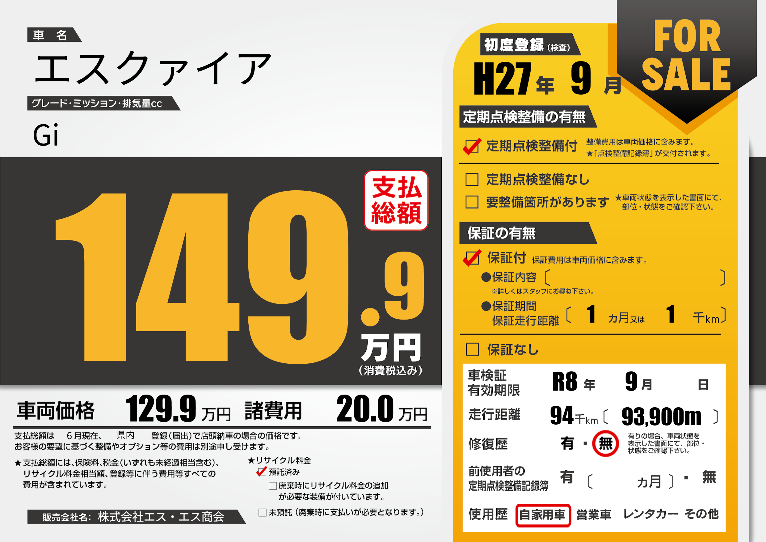 なし | 車検制限 | R8年9月---月 |