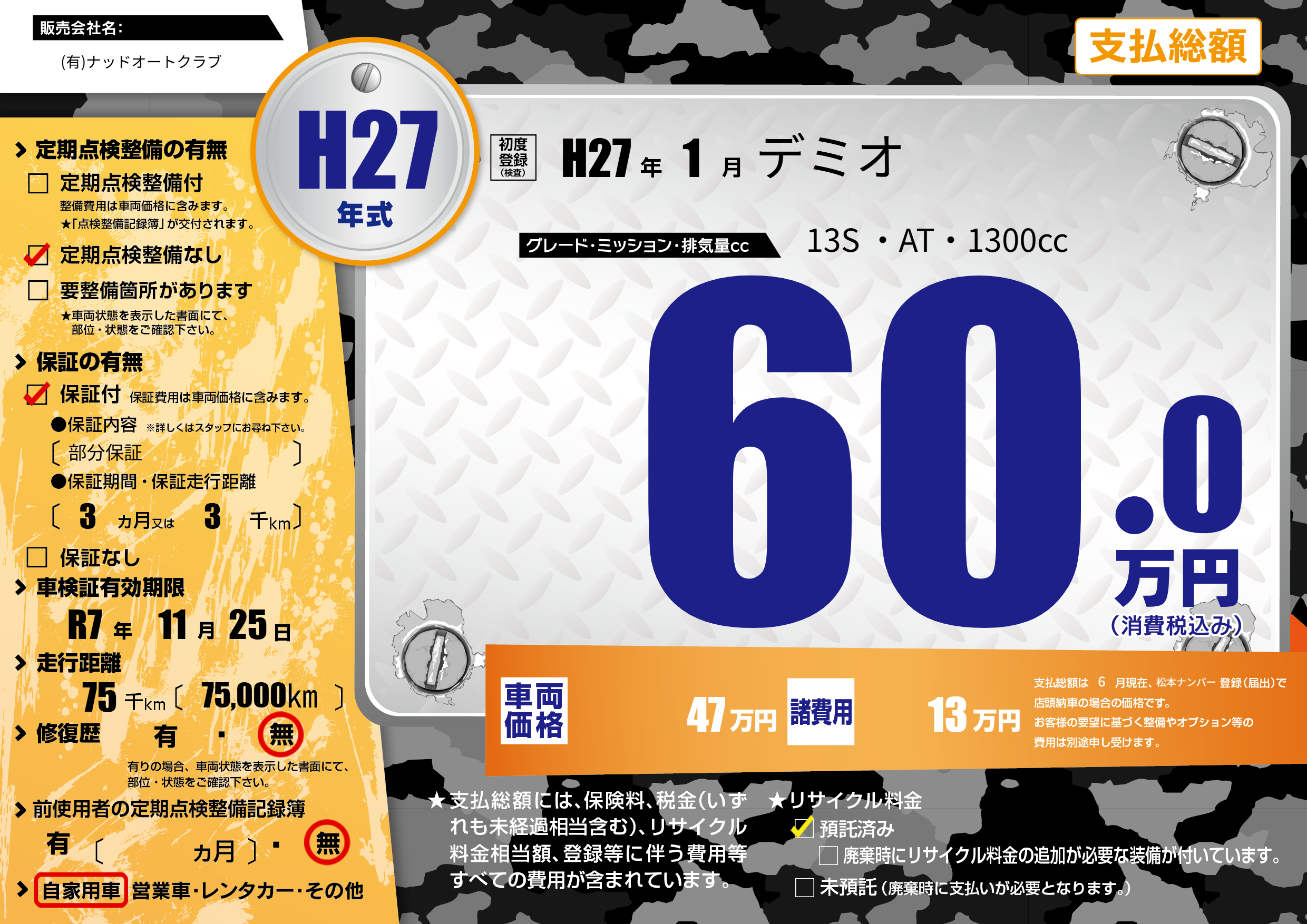 | 車名 | デミオ | グレード ミッション 排気量 |