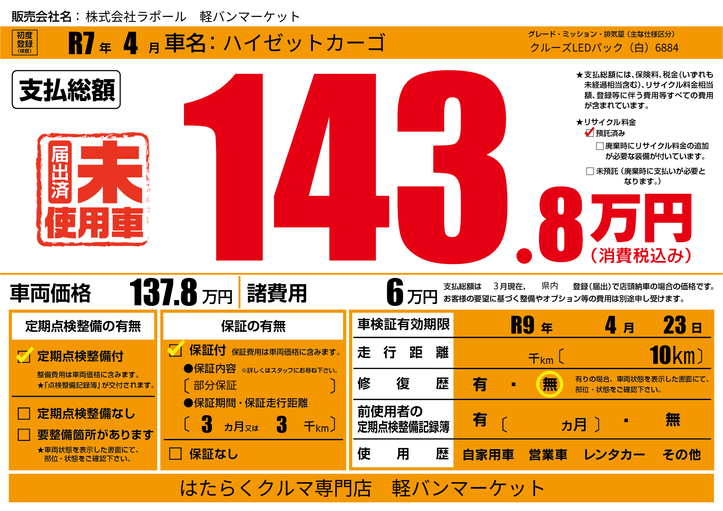 | 車名 | ハイゼットカーゴ | グレード ミッション 排気量 |