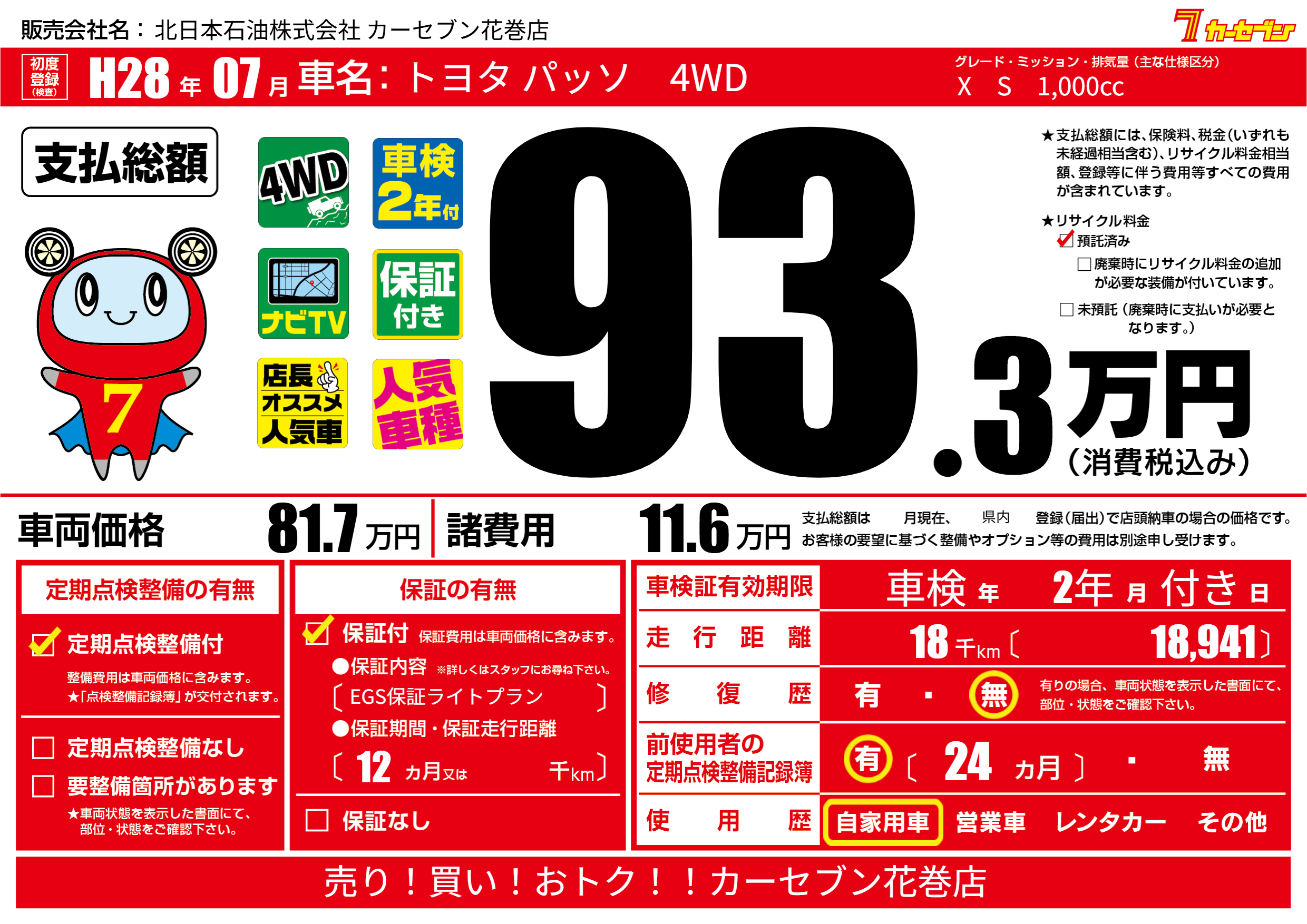| 車名 | トヨタ パッソ 4WD | グレード ミッション 排気量 |