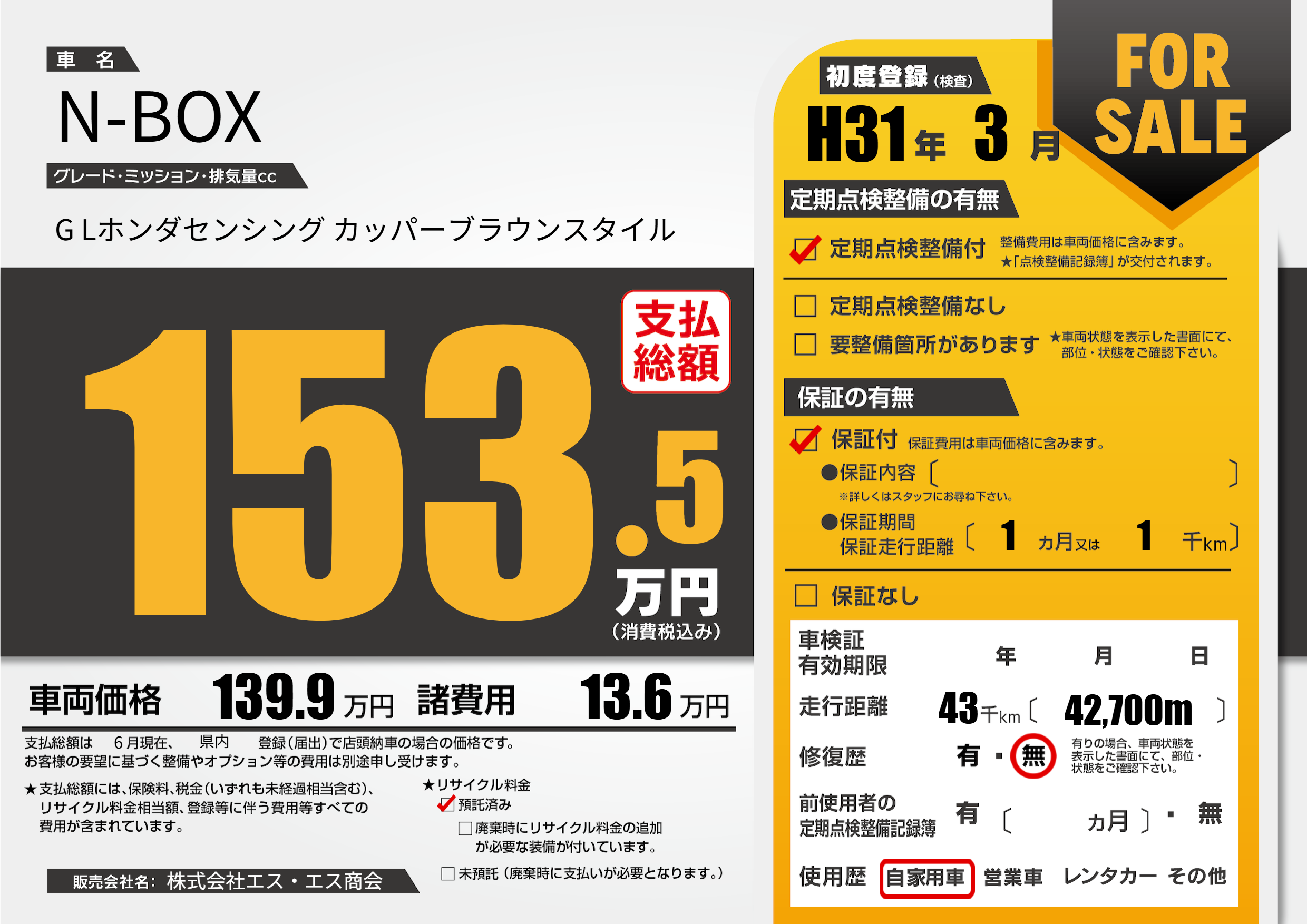 | 走行キロ | 4.3万km | 初年度登録 | H31年3月 |