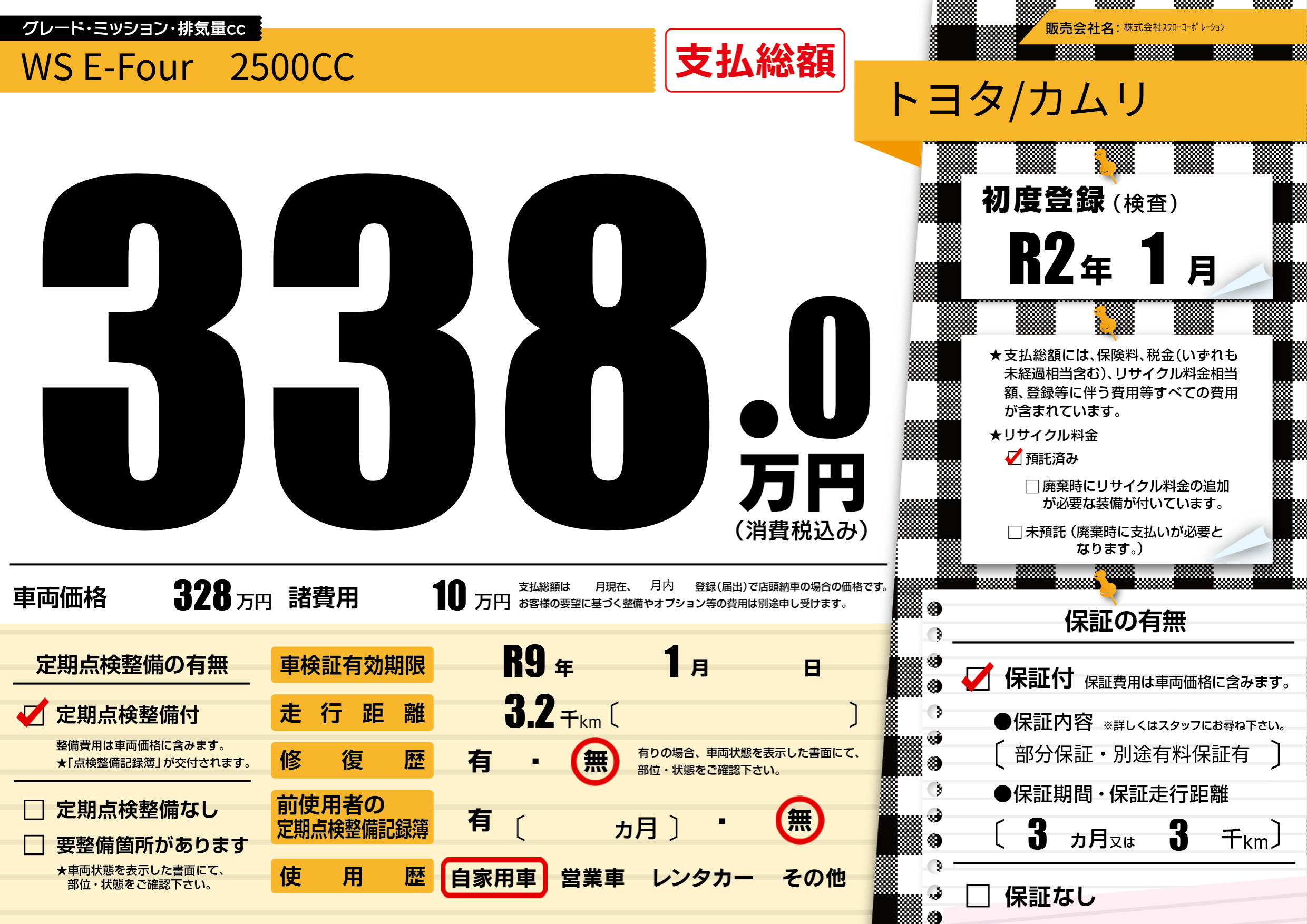 保証付き 保証内容(部分保証・別途有料保証有) 3ヶ月または(3)千kmまで |