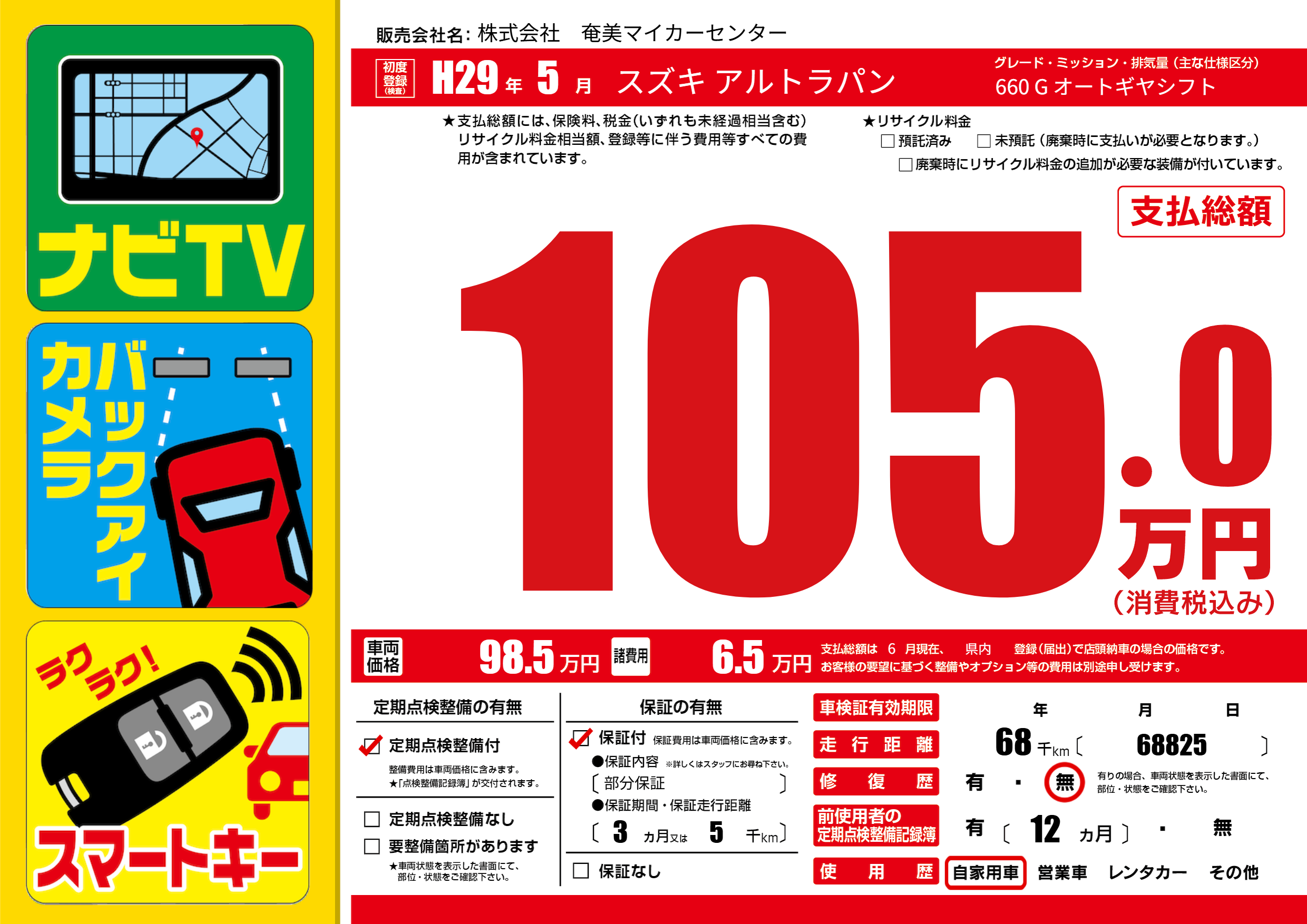 | 走行キロ | 6.8万km | 初年度登録 | H29年5月 |
