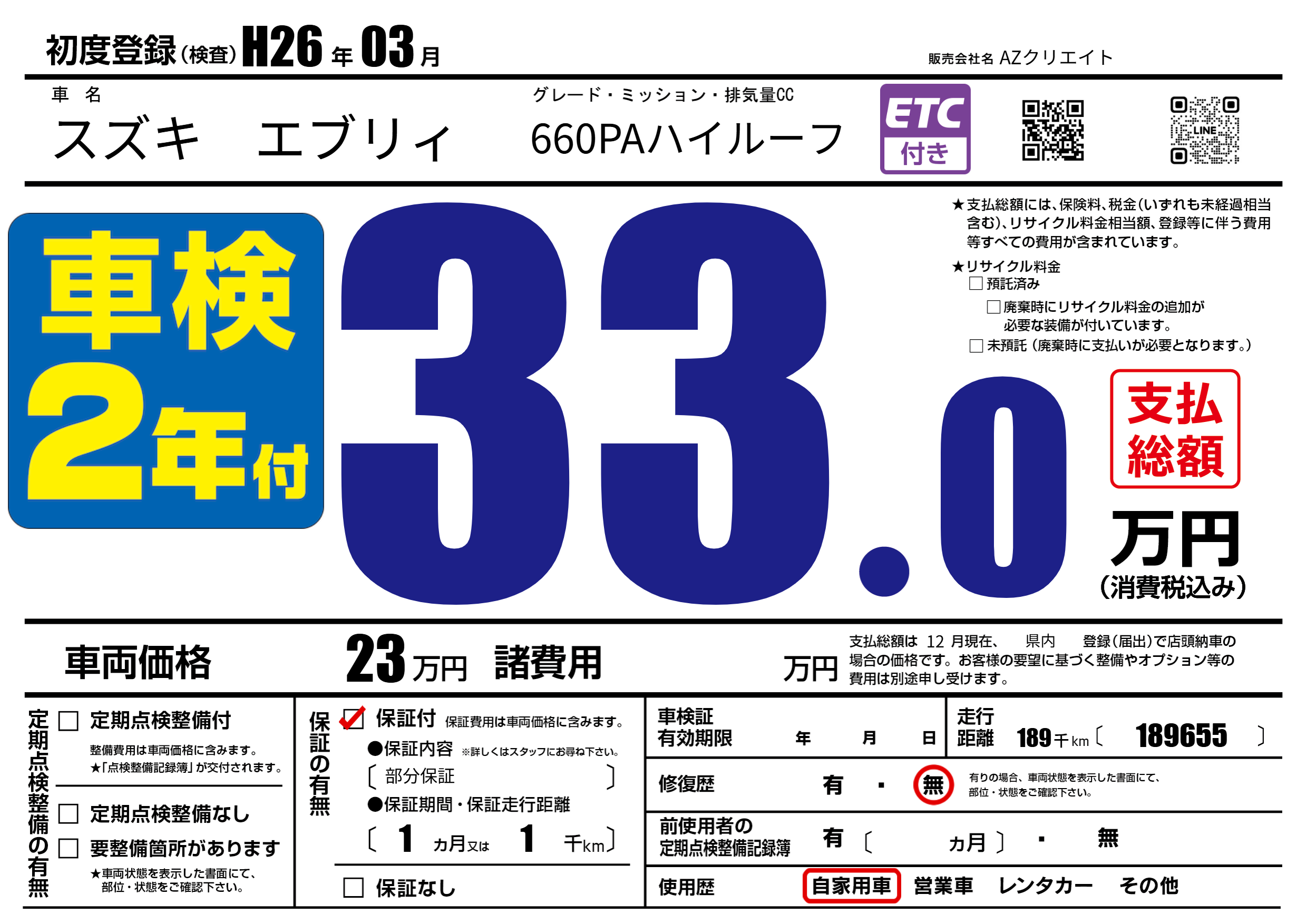 | 走行キロ | 18.9万km | 初年度登録 | H26年03月 |