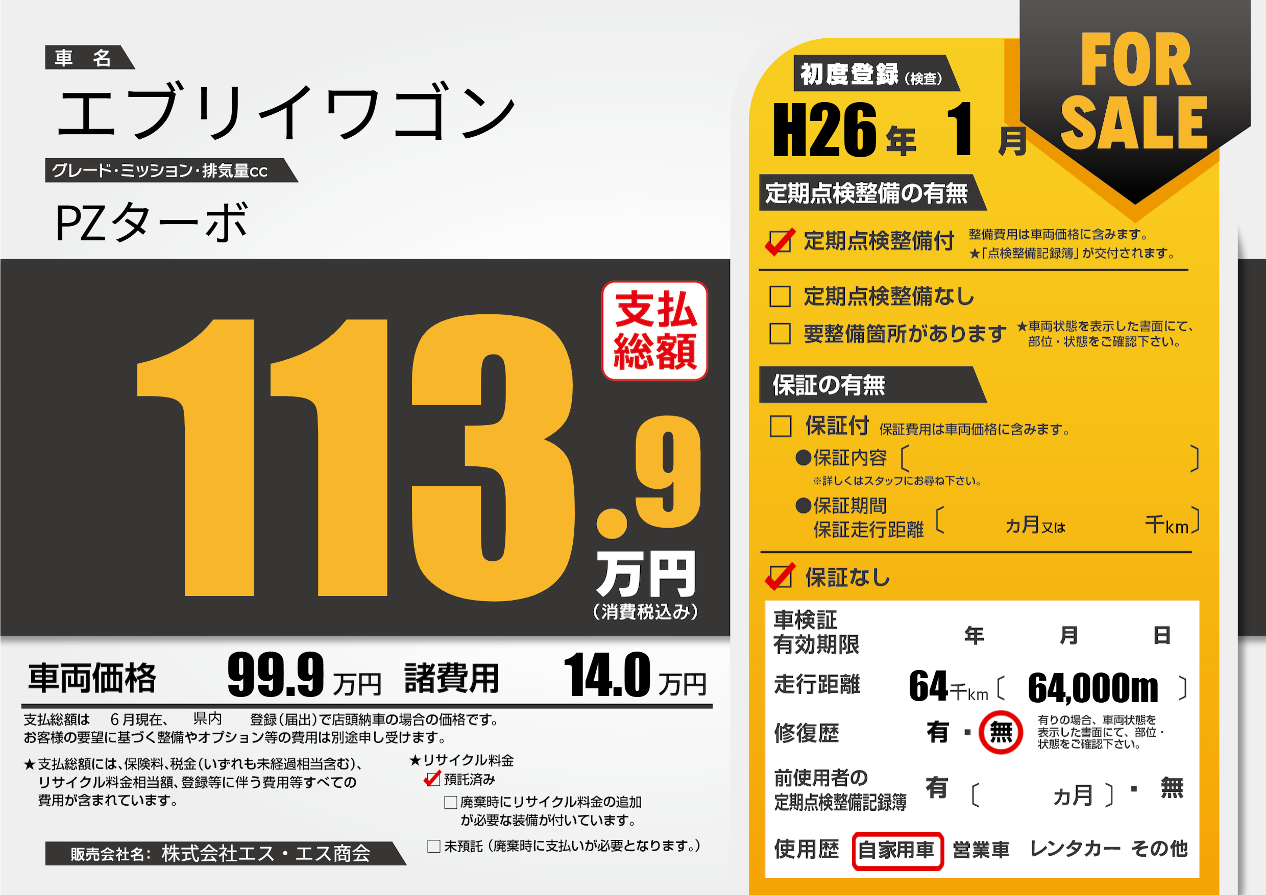 | 車名 | エブリイワゴン | グレード ミッション 排気量 |