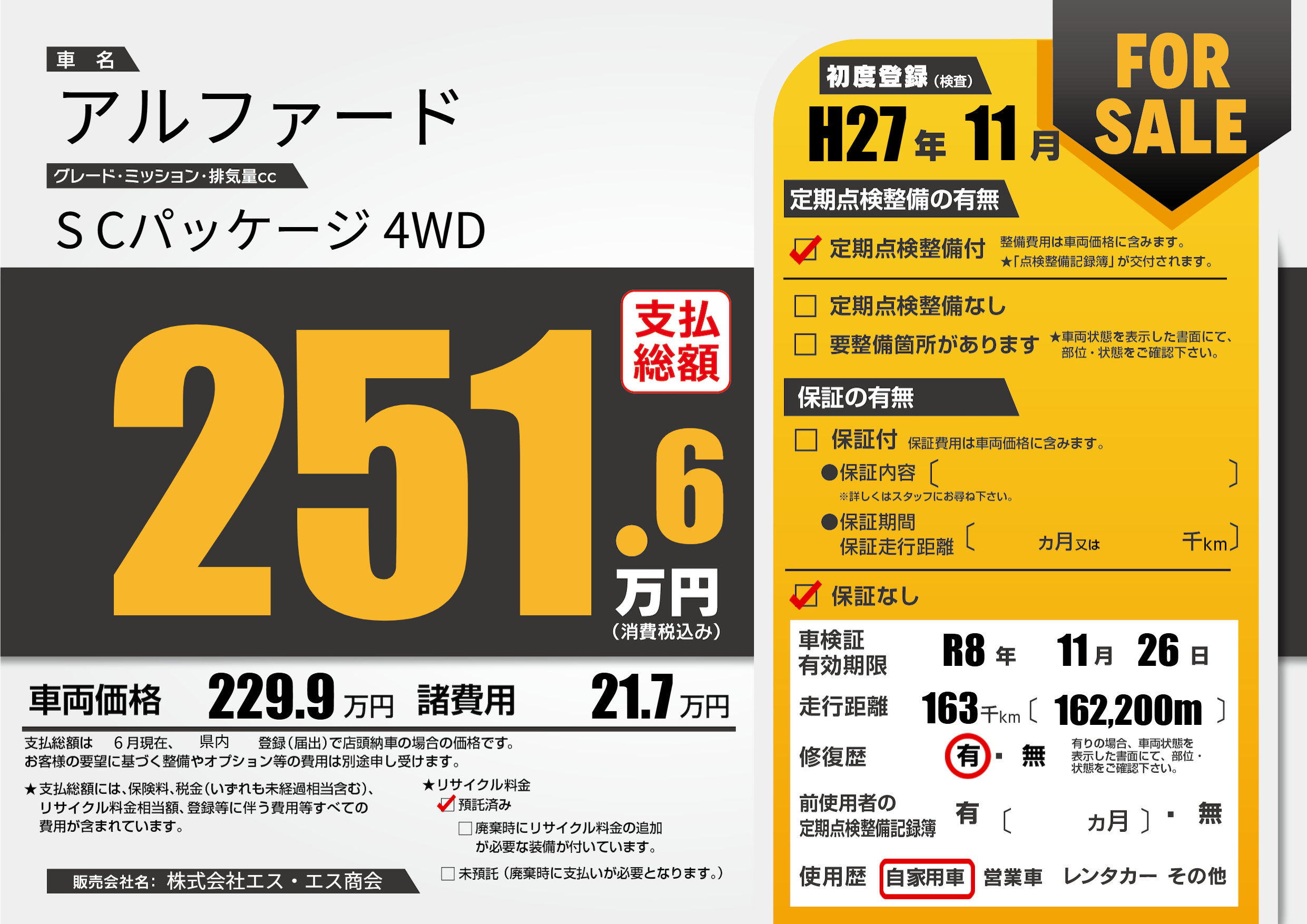 | 走行キロ | 16.3万km | 初年度登録 | H27年11月 |