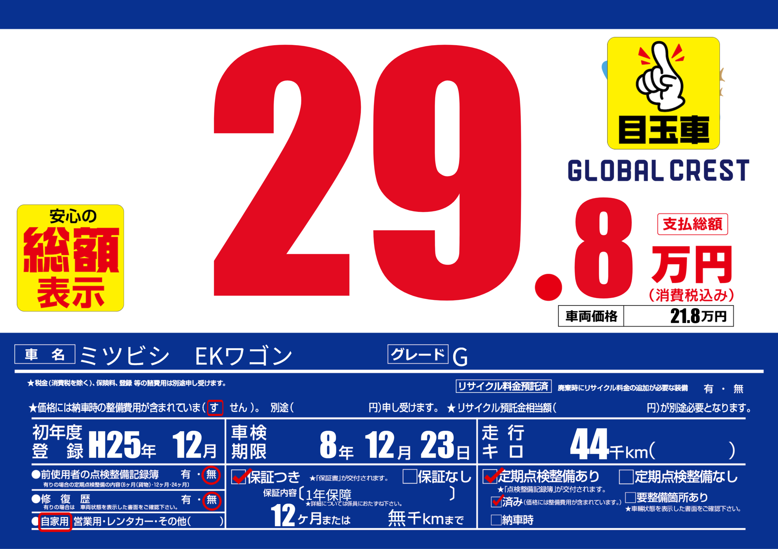 | 車名 | ミツビシ EKワゴン | グレード ミッション 排気量 |