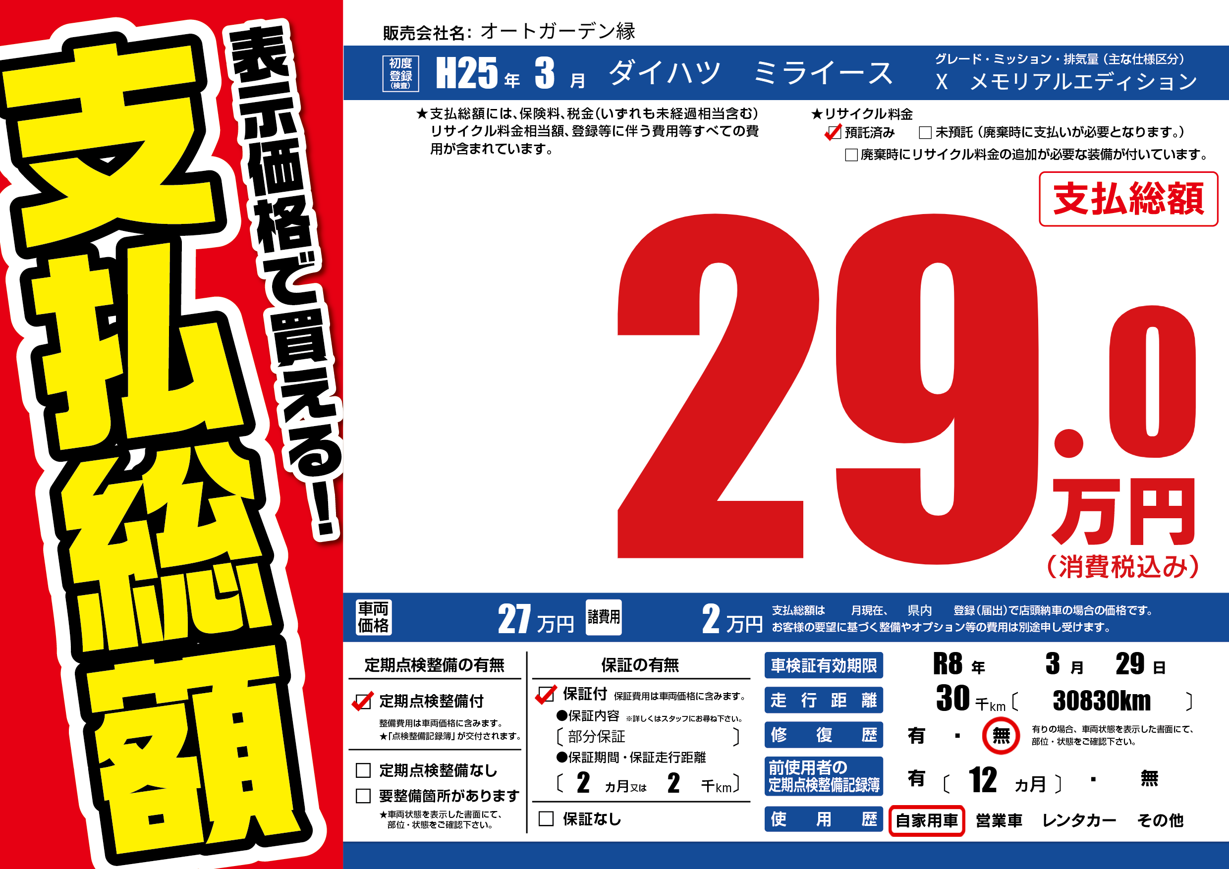 | 走行キロ | 3万km | 初年度登録 | H25年3月 |