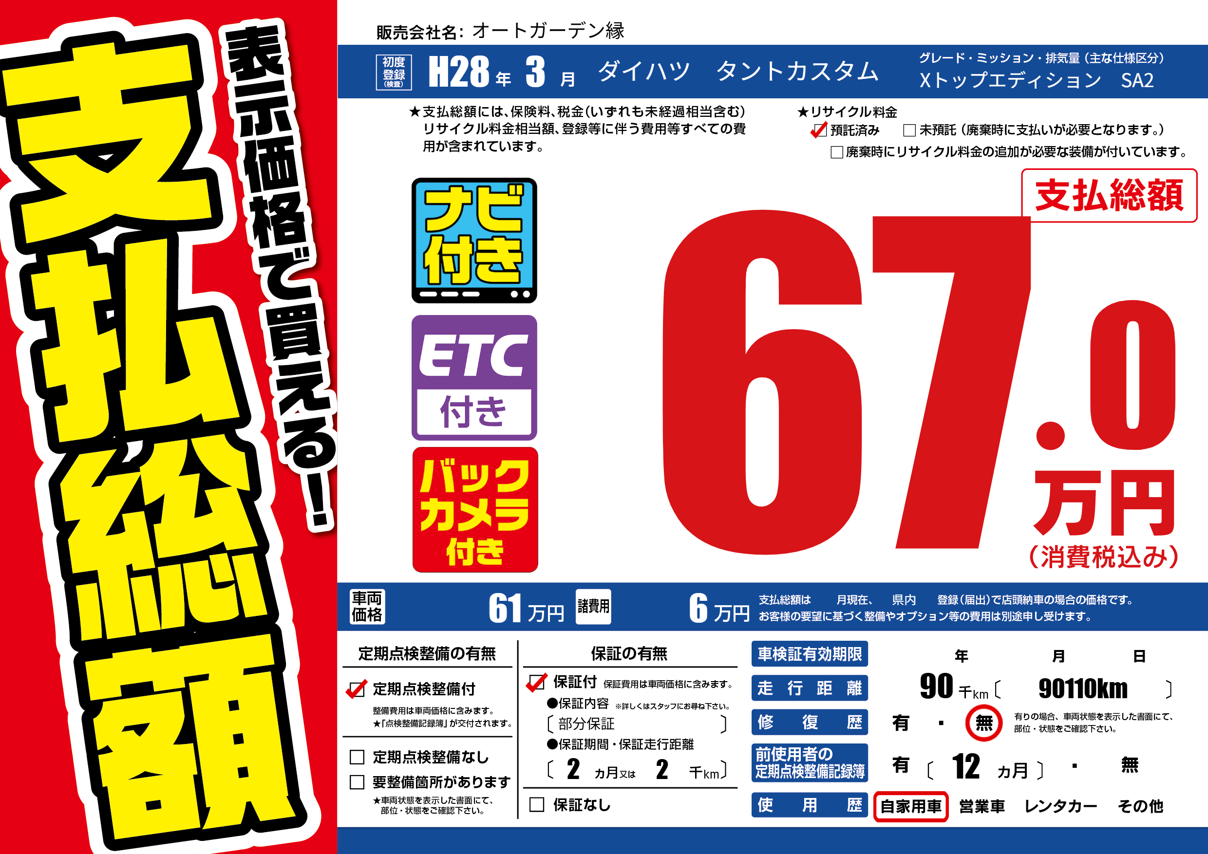 | 車名 | ダイハツ タントカスタム | グレード ミッション 排気量 |
