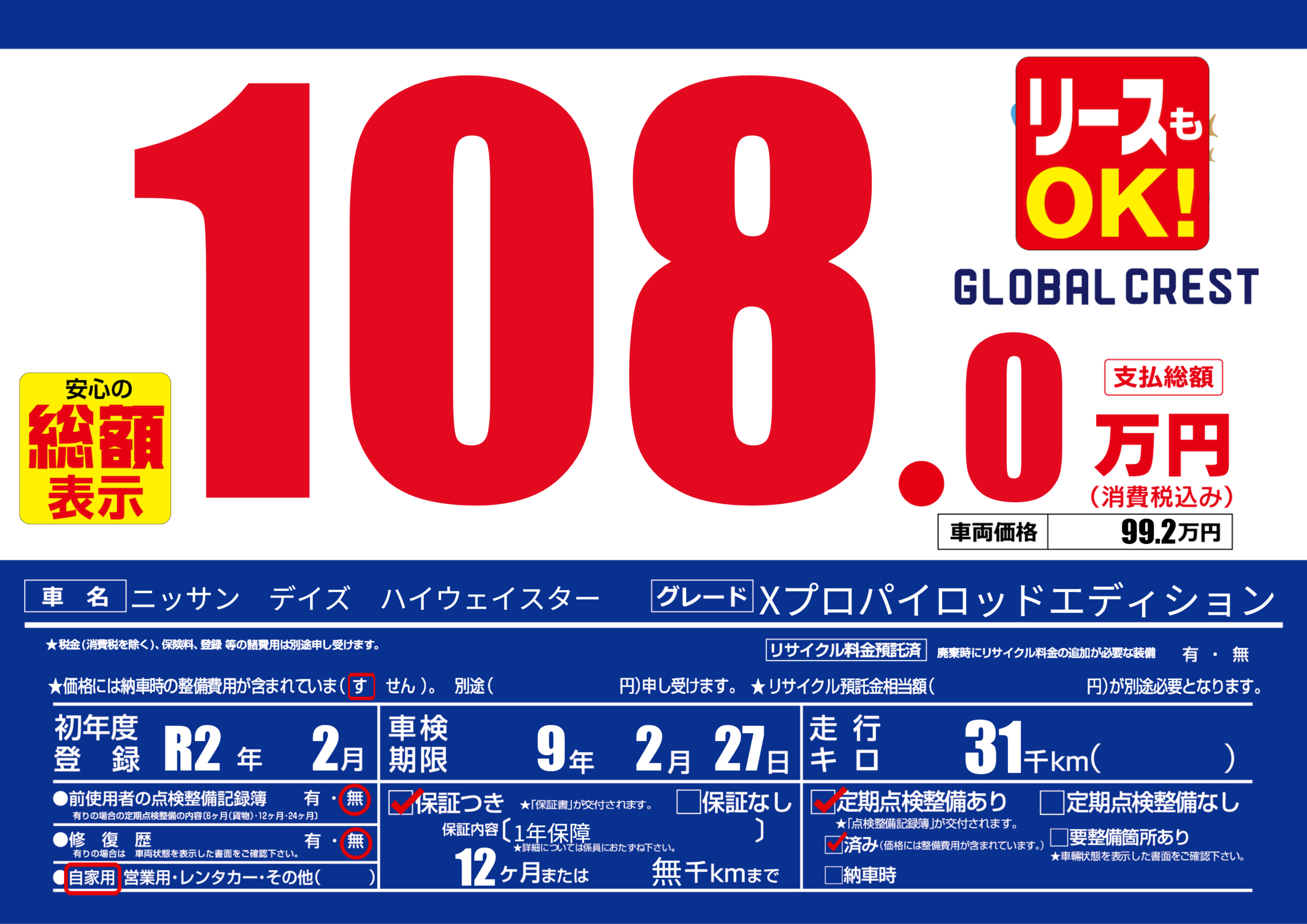 | 定期点検整備 | 定期点検整備あり 定期点検整備済み | ||