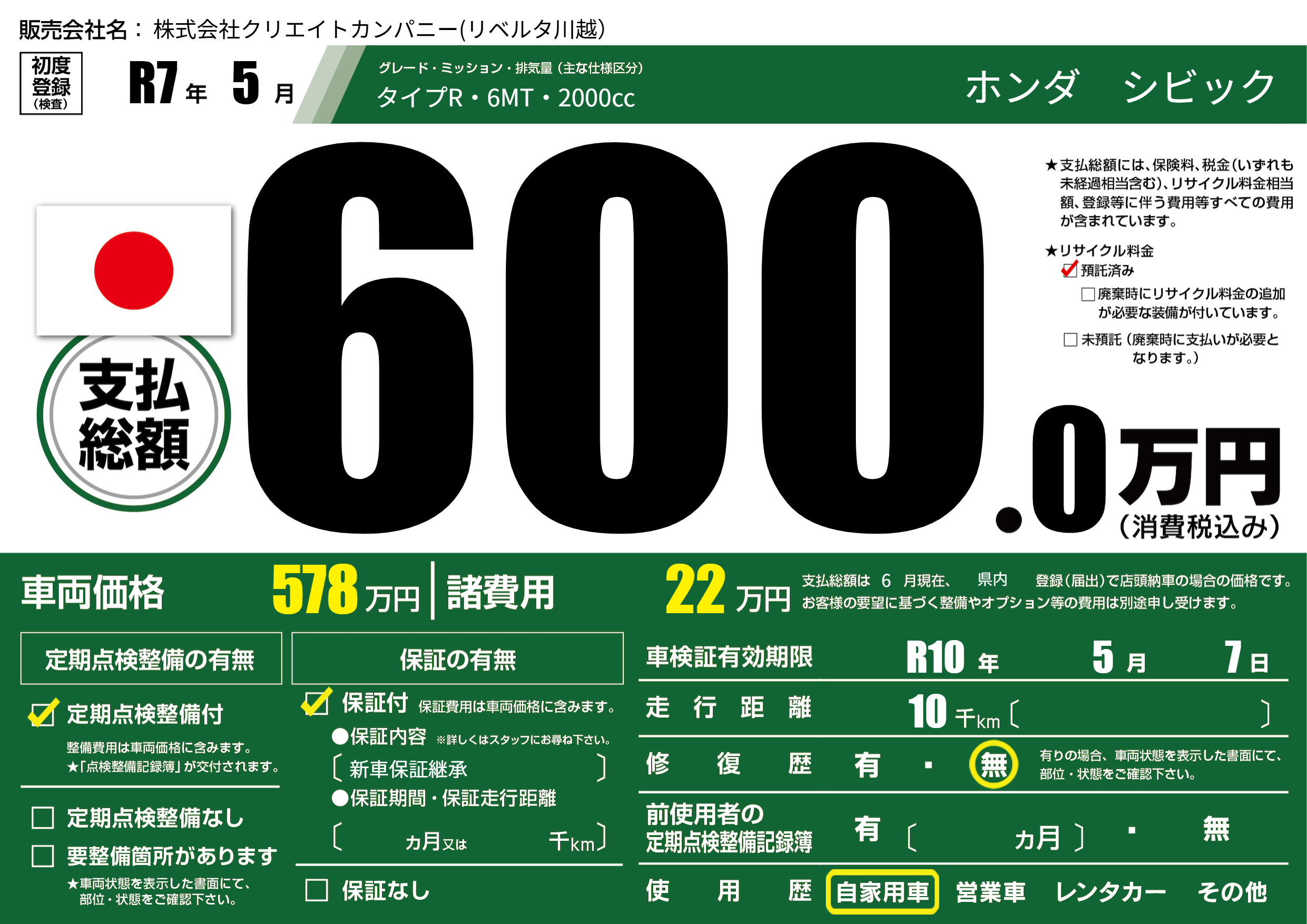 | 走行キロ | 1万km | 初年度登録 | R7年5月 |