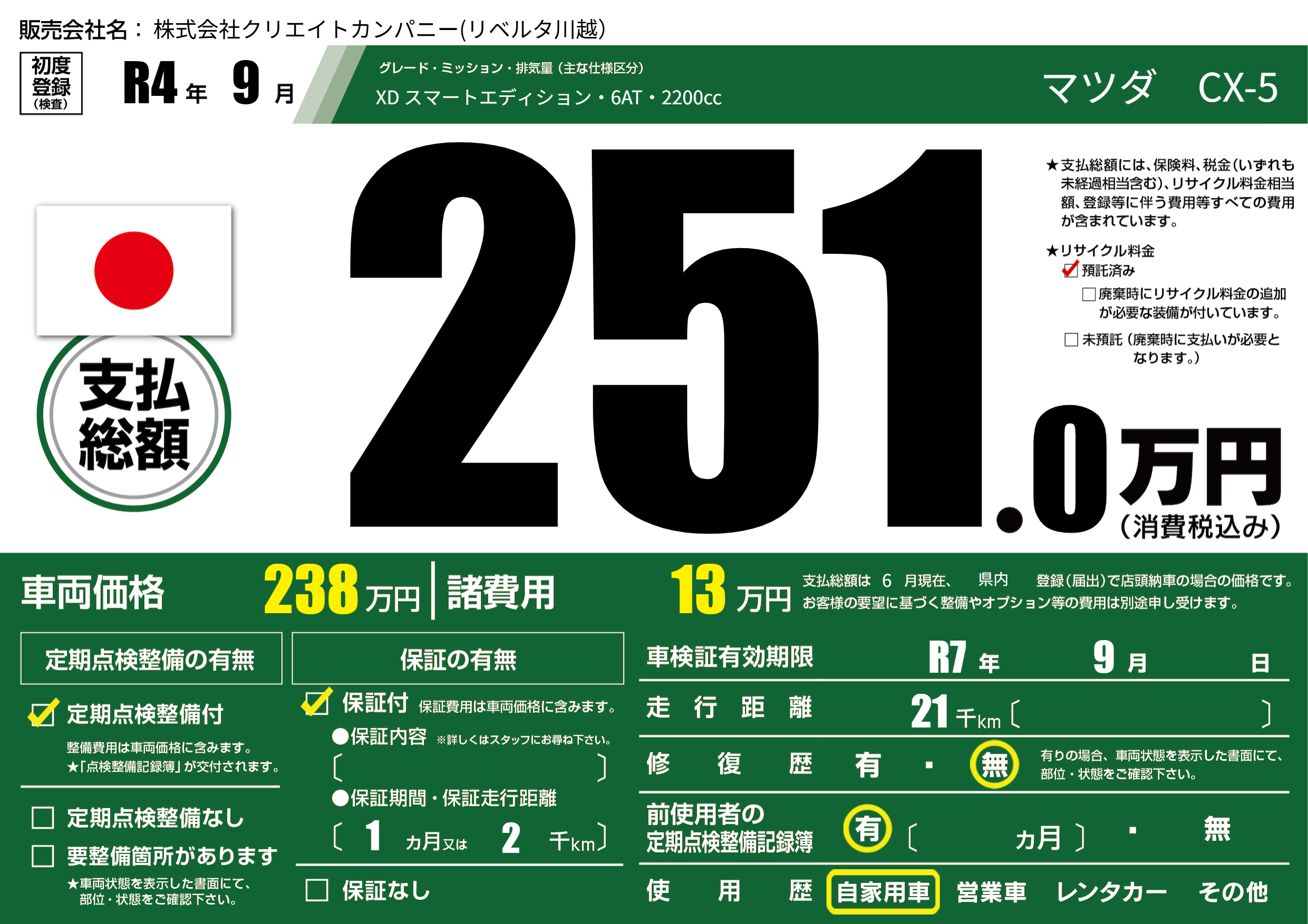 | 走行キロ | 2.1万km | 初年度登録 | R4年9月 |