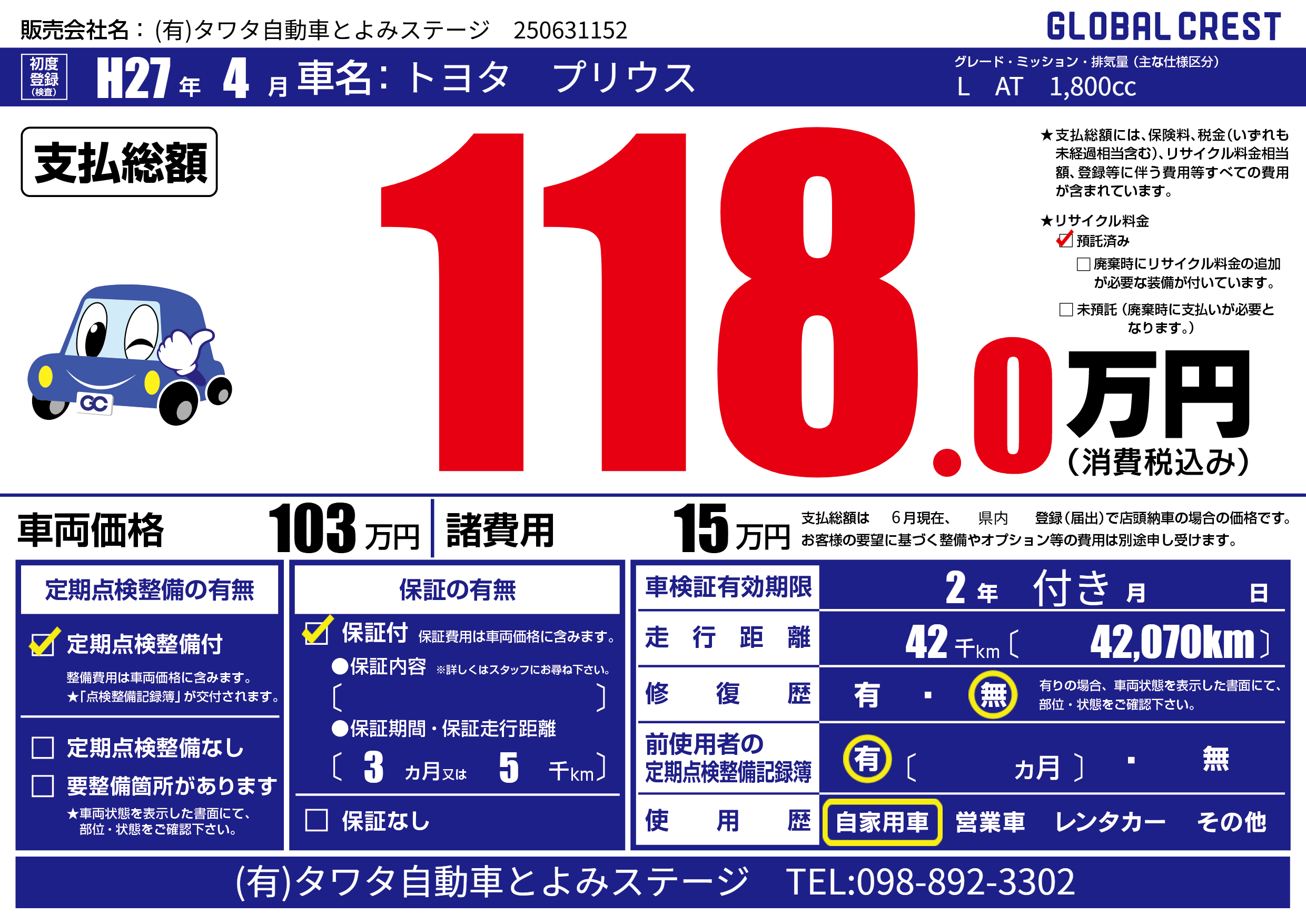 | 車名 | トヨタ プリウス | グレード ミッション 排気量 |