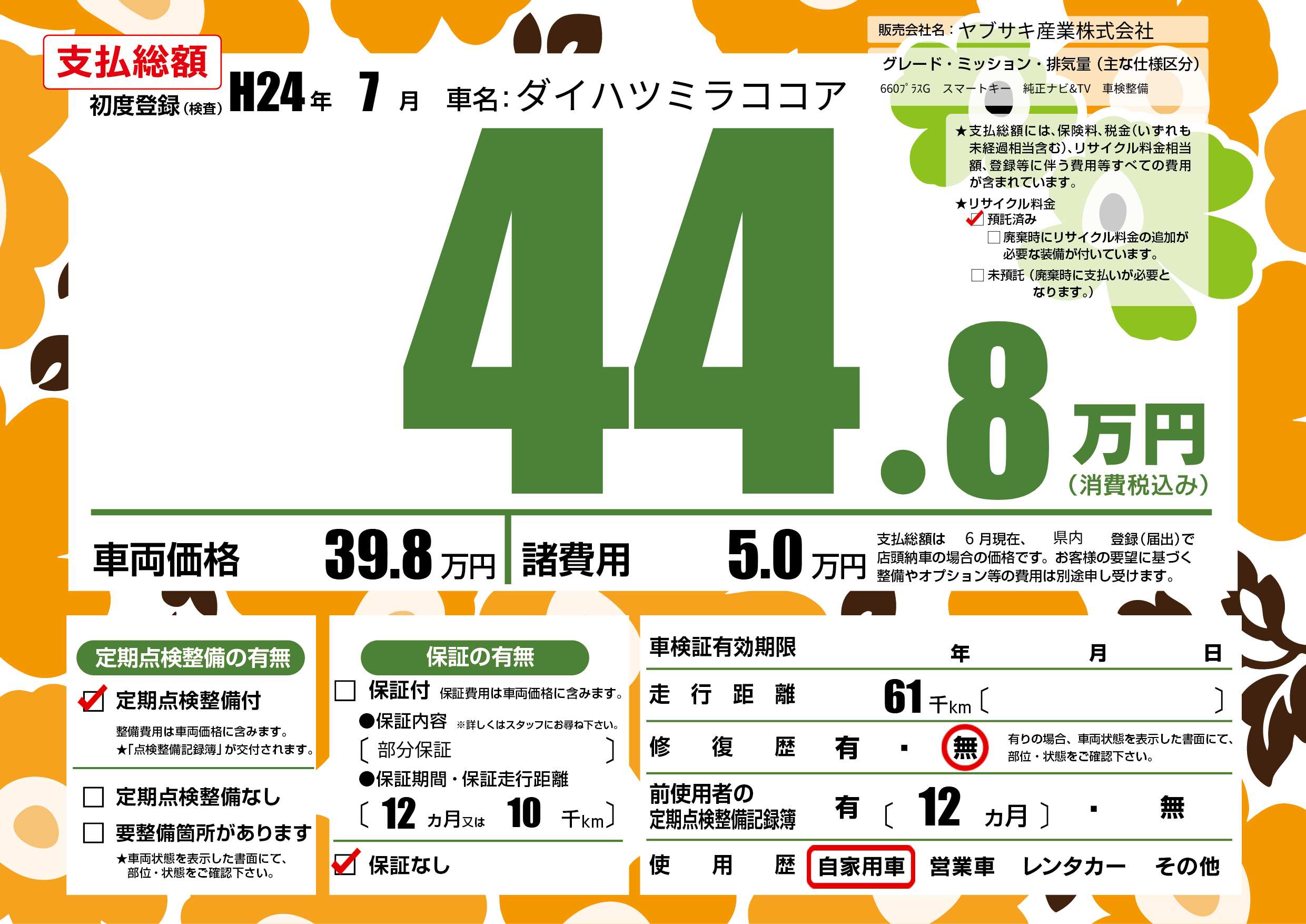 | 車名 | ダイハツミラココア | グレード ミッション 排気量 |