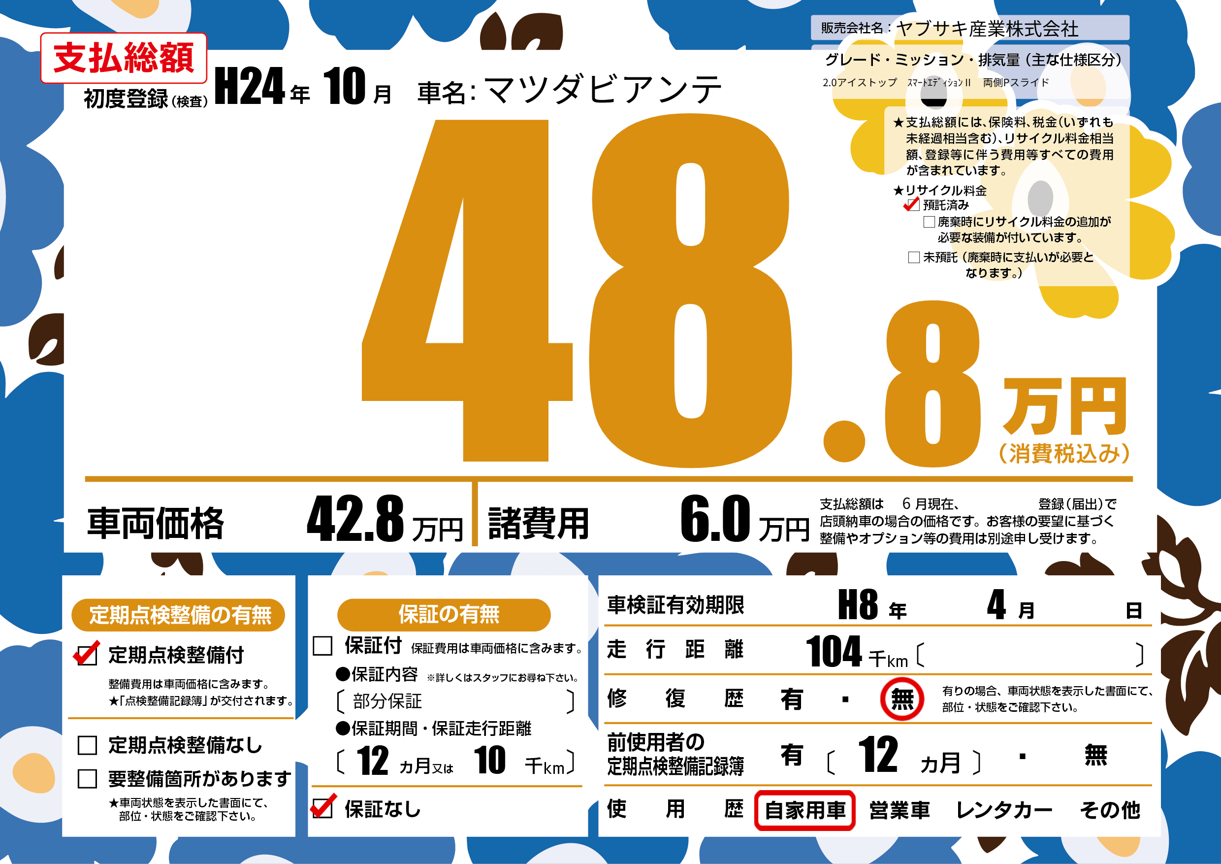 | 走行キロ | 10.4万km | 初年度登録 | H24年10月 |