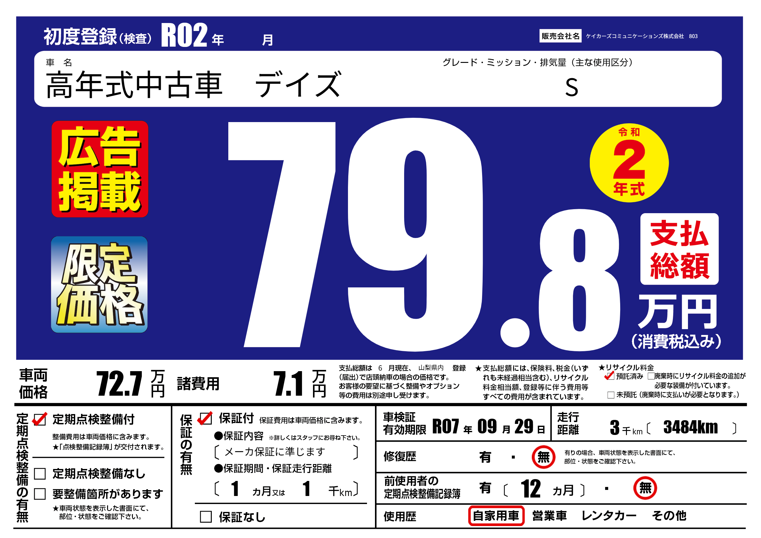 | 車名 | 高年式中古車 デイズ | グレード ミッション 排気量 |