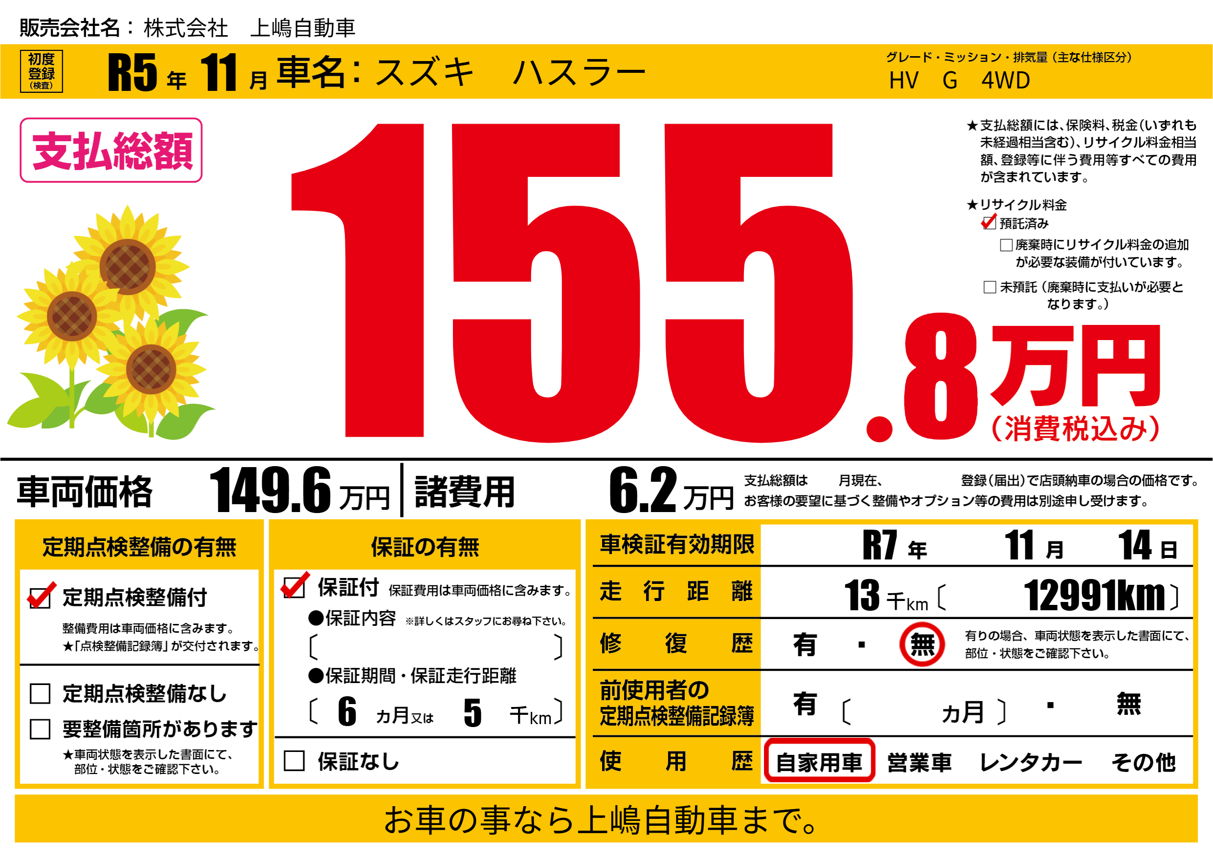 | 走行キロ | 1.3万km | 初年度登録 | R5年11月 |