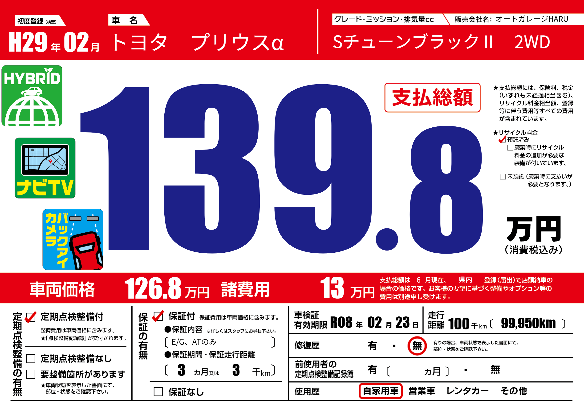 | 車名 | トヨタ プリウスα | グレード ミッション 排気量 |