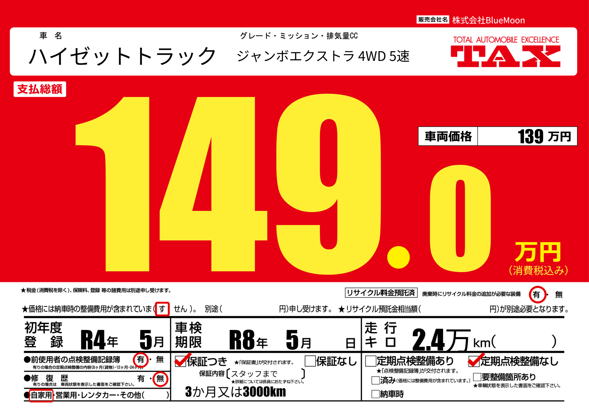 | 車名 | ハイゼットトラック | グレード ミッション 排気量 |