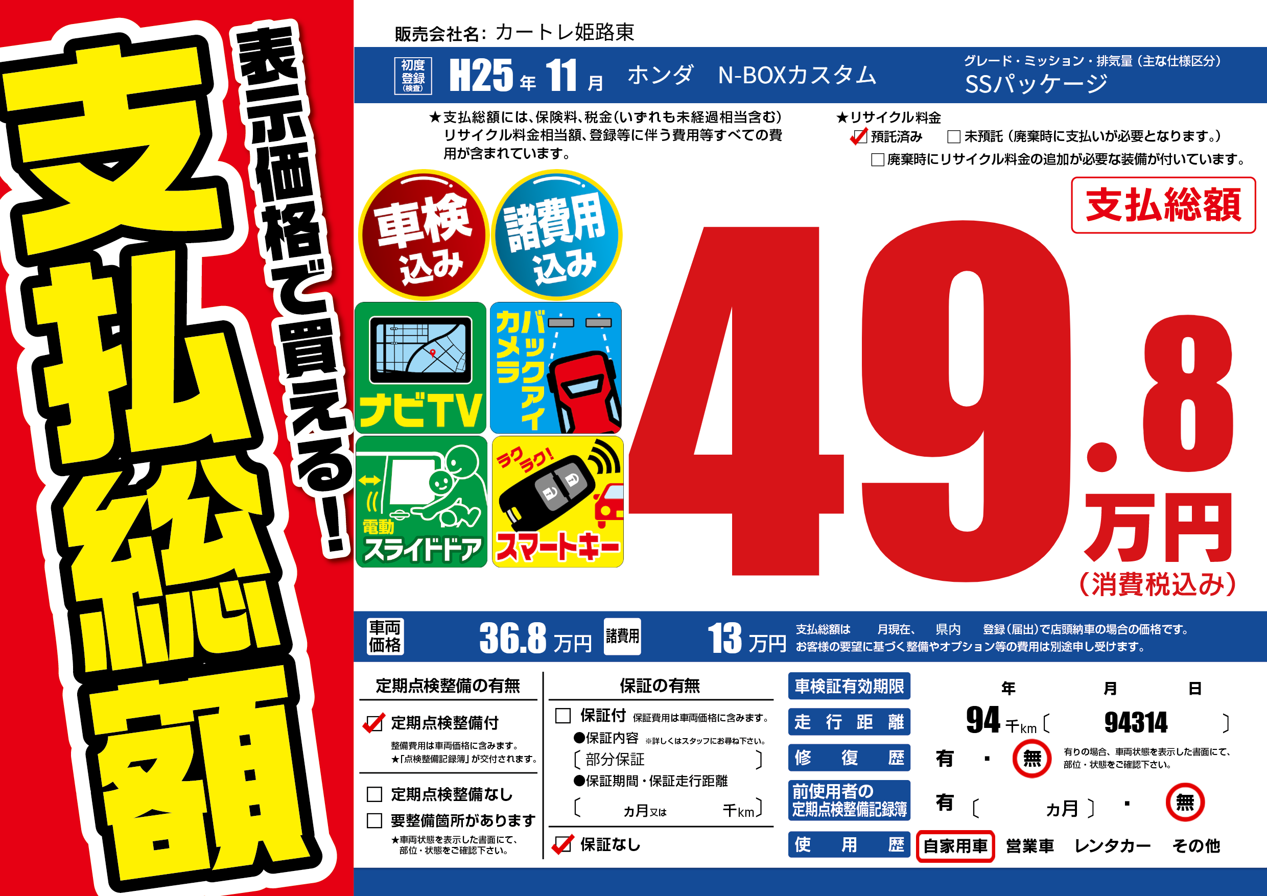 | 走行キロ | 9.4万km | 初年度登録 | H25年11月 |