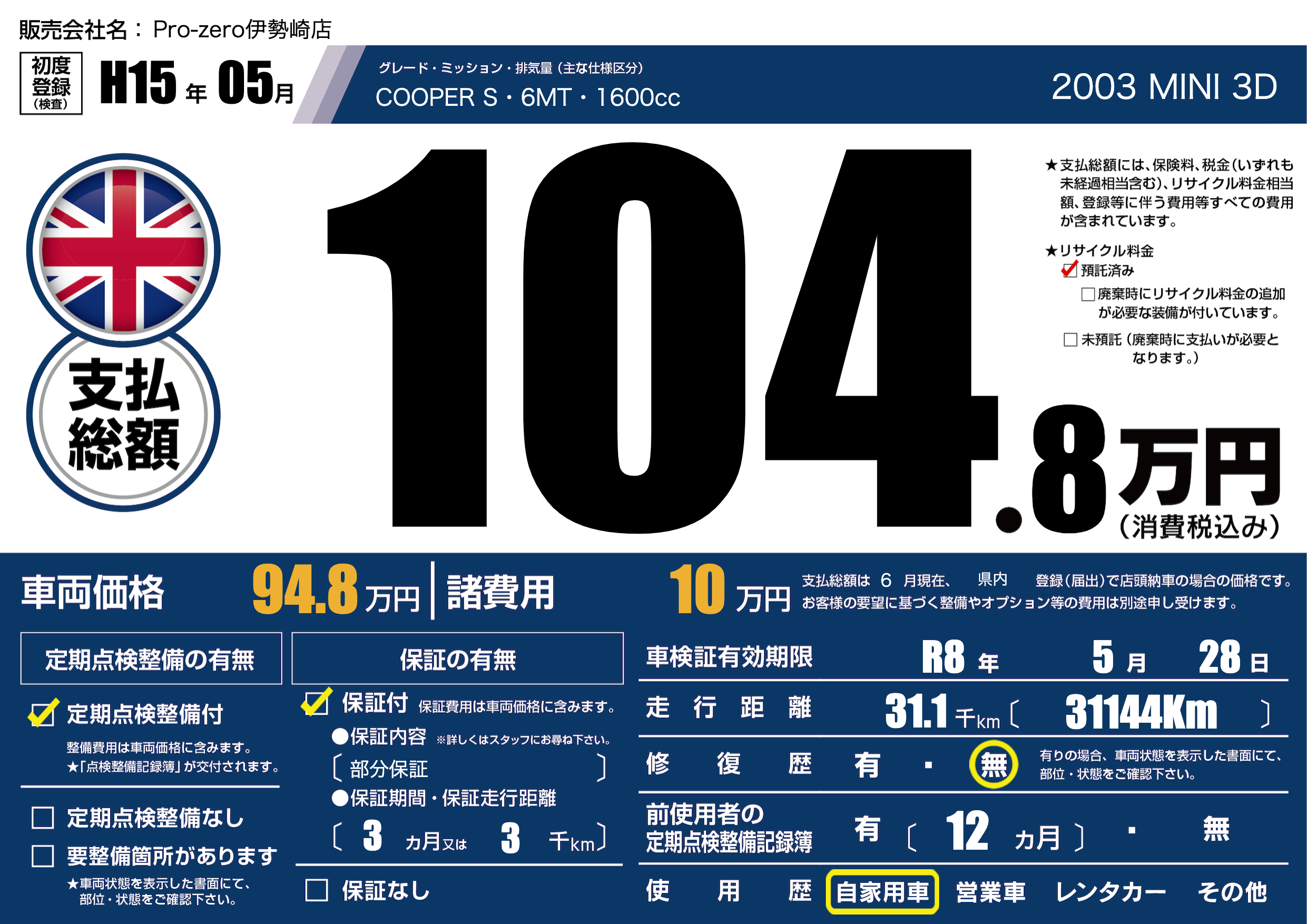 | 車名 | 2003 MINI 3D | グレード ミッション 排気量 |