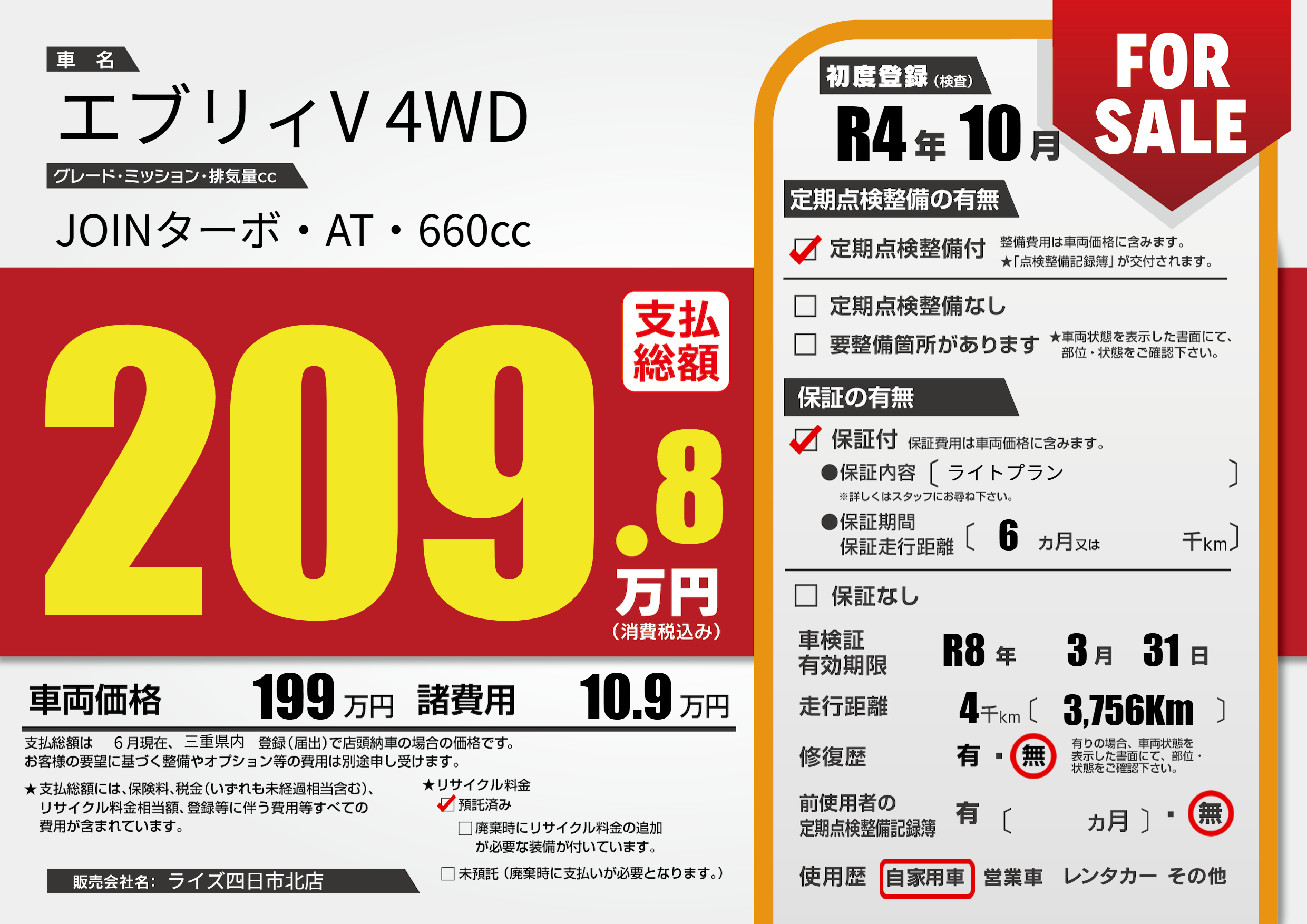 | 車名 | エブリィV 4WD | グレード ミッション 排気量 |