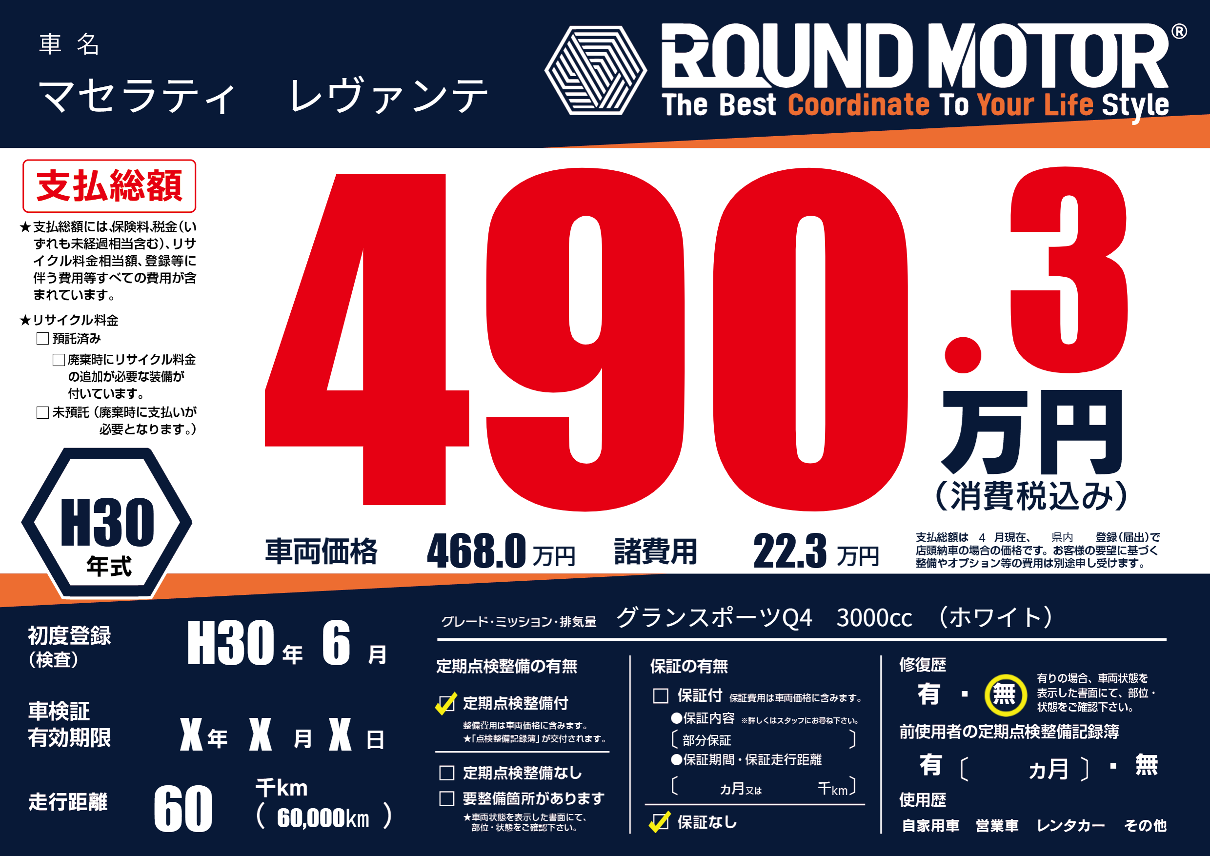 保証なし 保証内容(部分保証) ---ヶ月または()千kmまで |