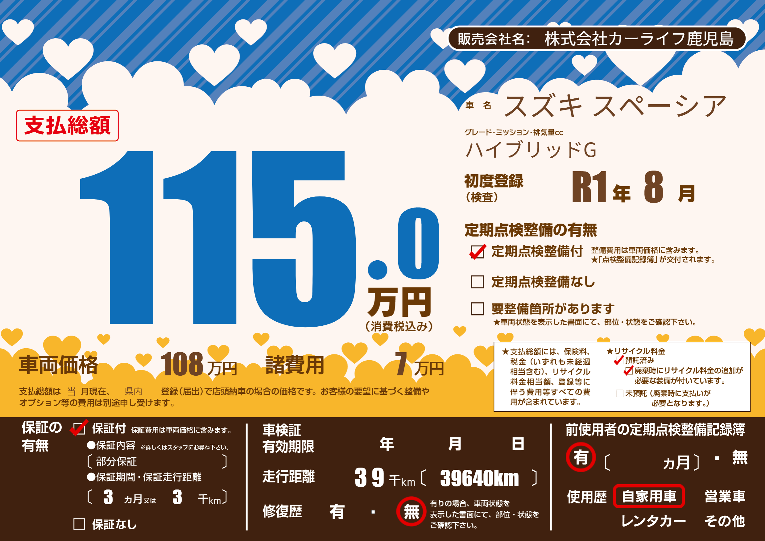 | 走行キロ | 0.3万km | 初年度登録 | R1年8月 |
