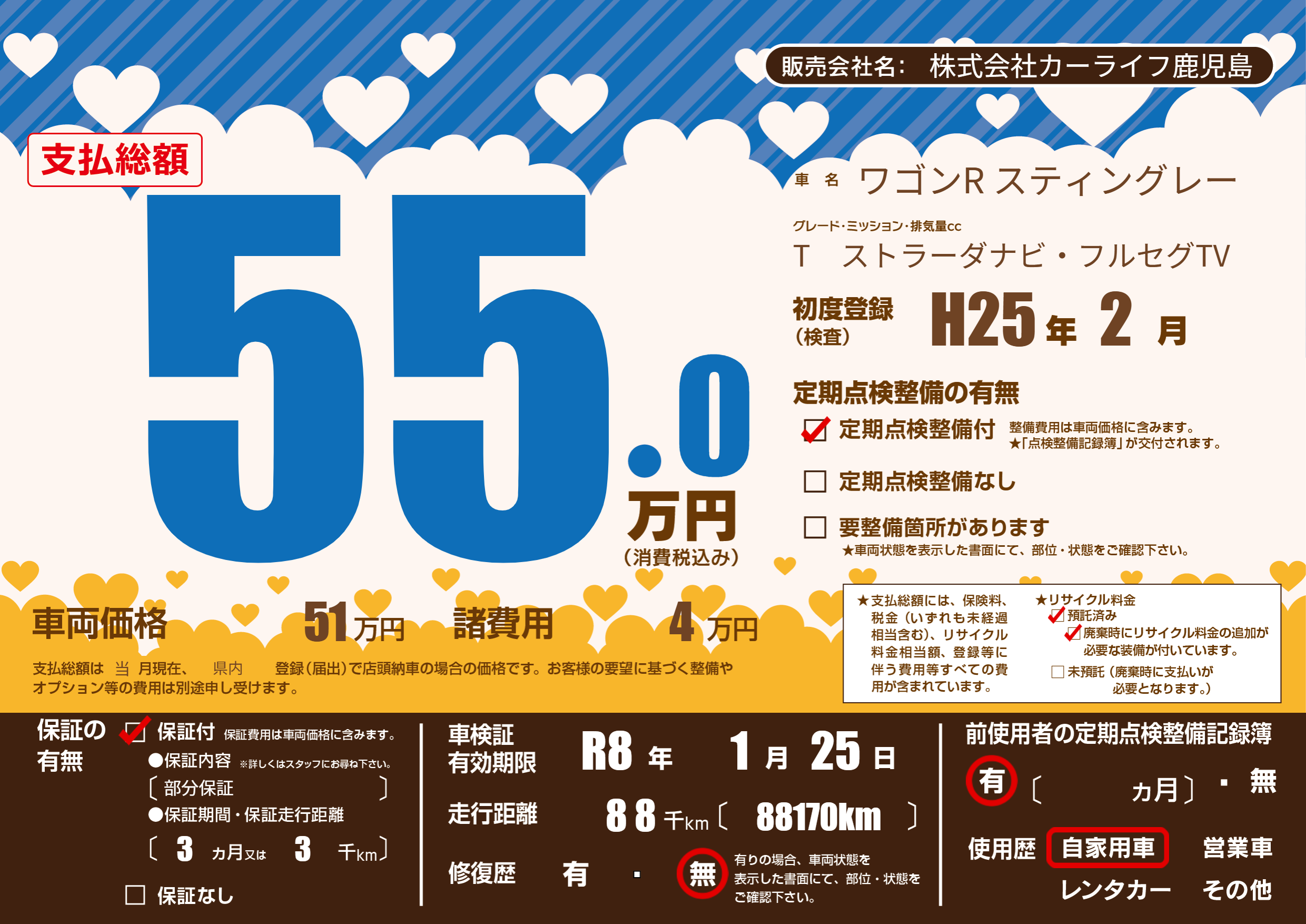 | 車名 | ワゴンR スティングレー | グレード ミッション 排気量 |