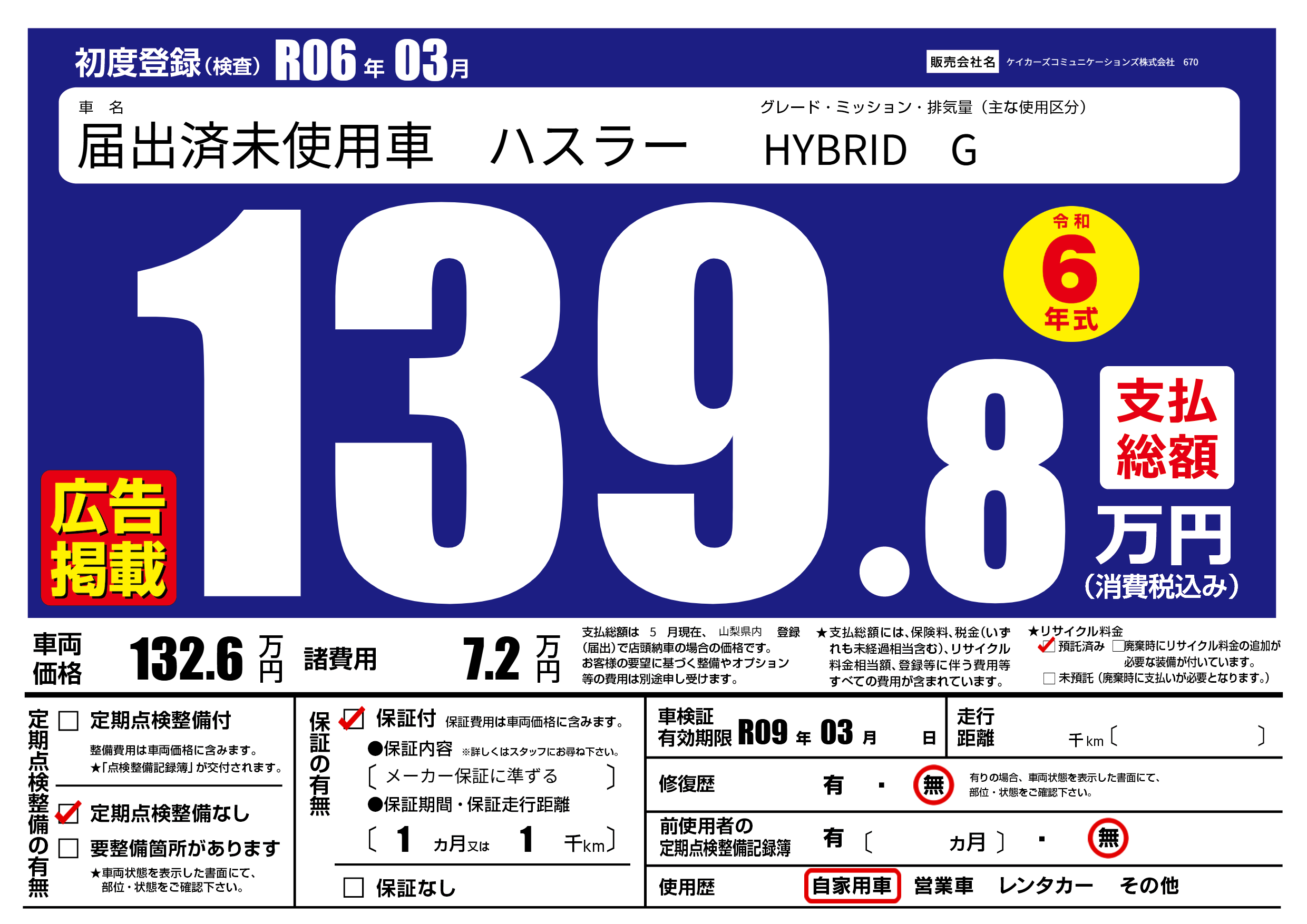 | 車名 | 届出済未使用車 ハスラー | グレード ミッション 排気量 |