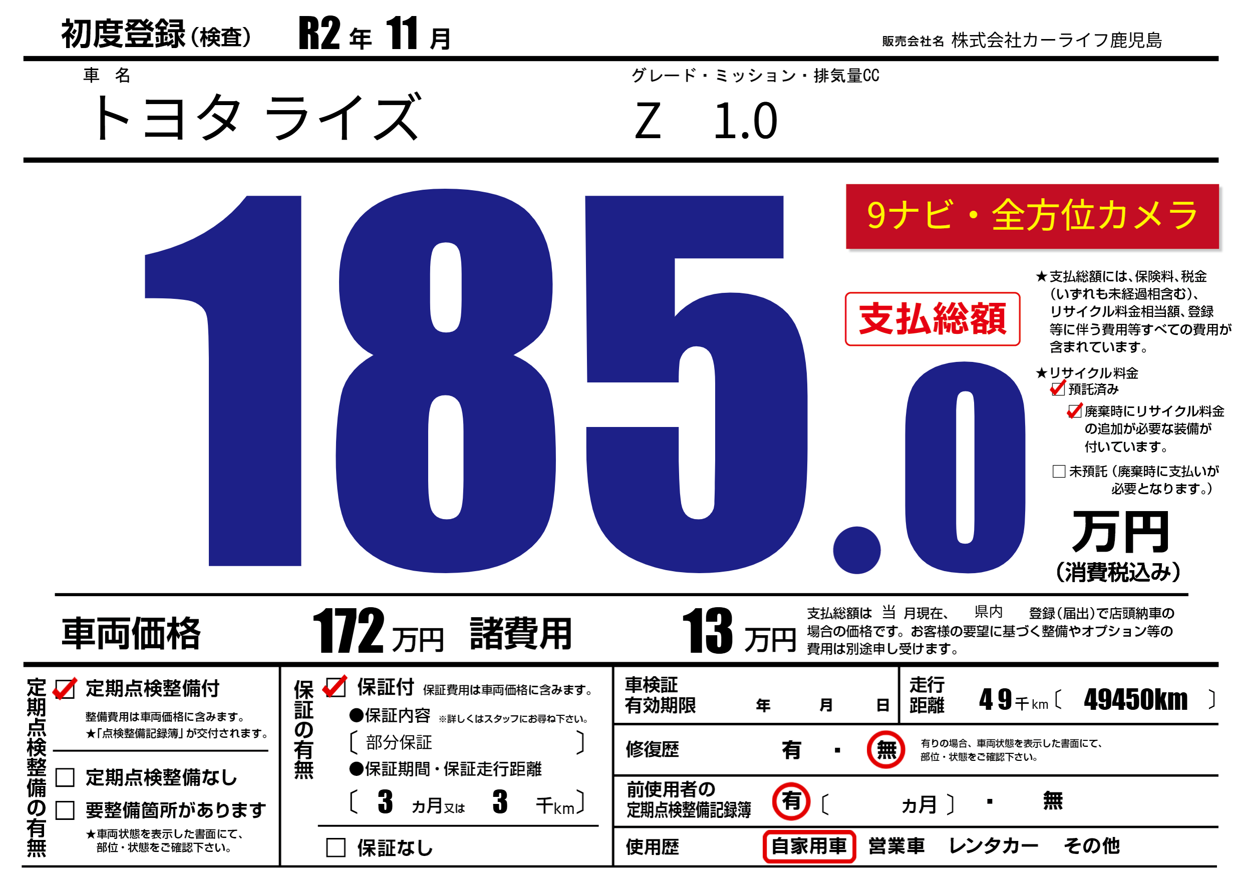 | 車名 | トヨタ ライズ | グレード ミッション 排気量 |