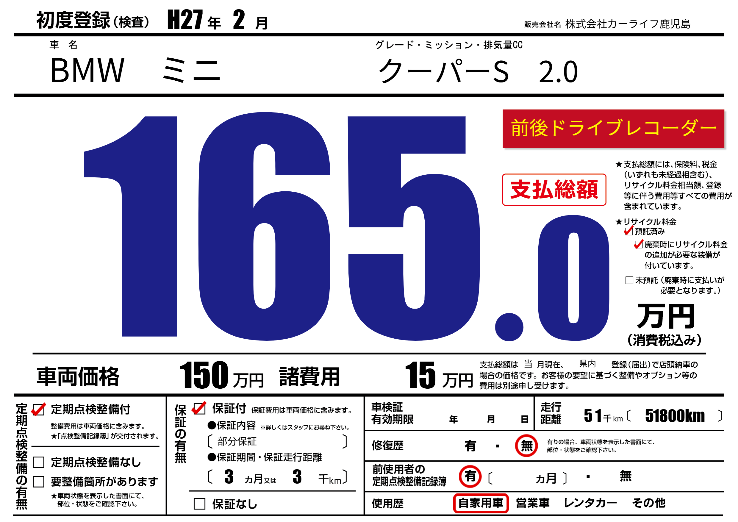 | 車名 | BMW ミニ | グレード ミッション 排気量 |