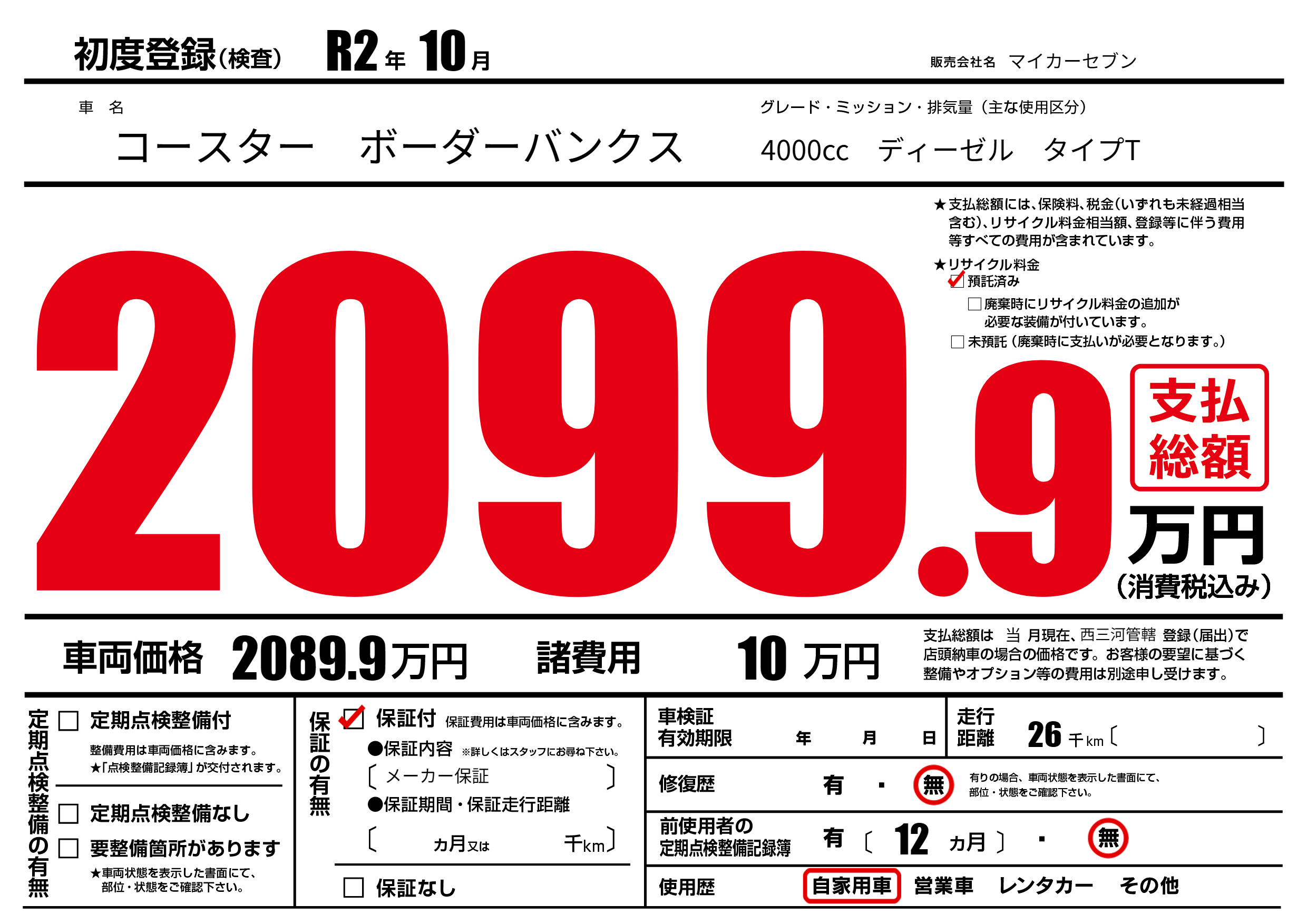 | 車名 | コースター ボーダーバンクス | グレード ミッション 排気量 |
