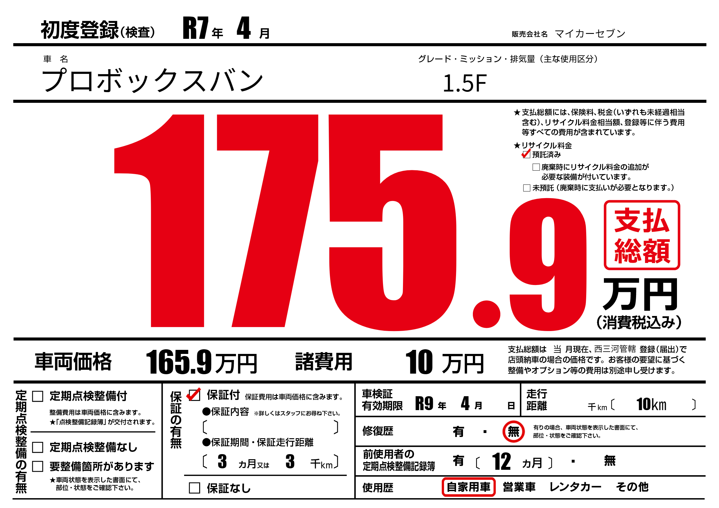 なし | 車検制限 | R9年4月---月 |