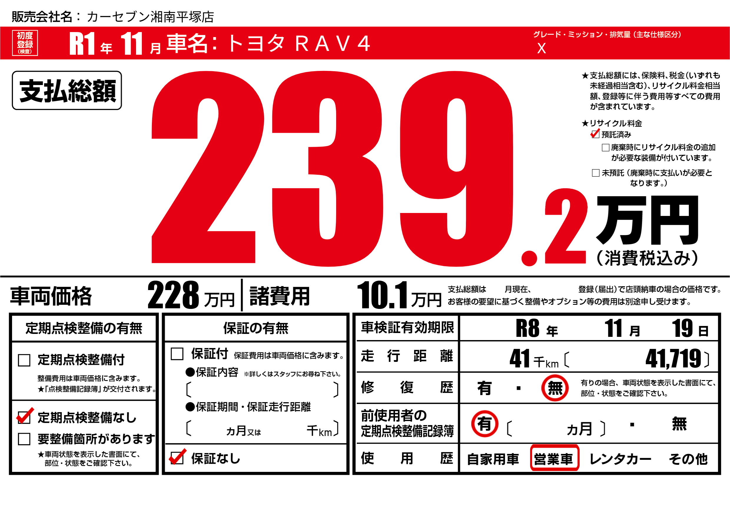 | 走行キロ | 4.1万km | 初年度登録 | R1年11月 |