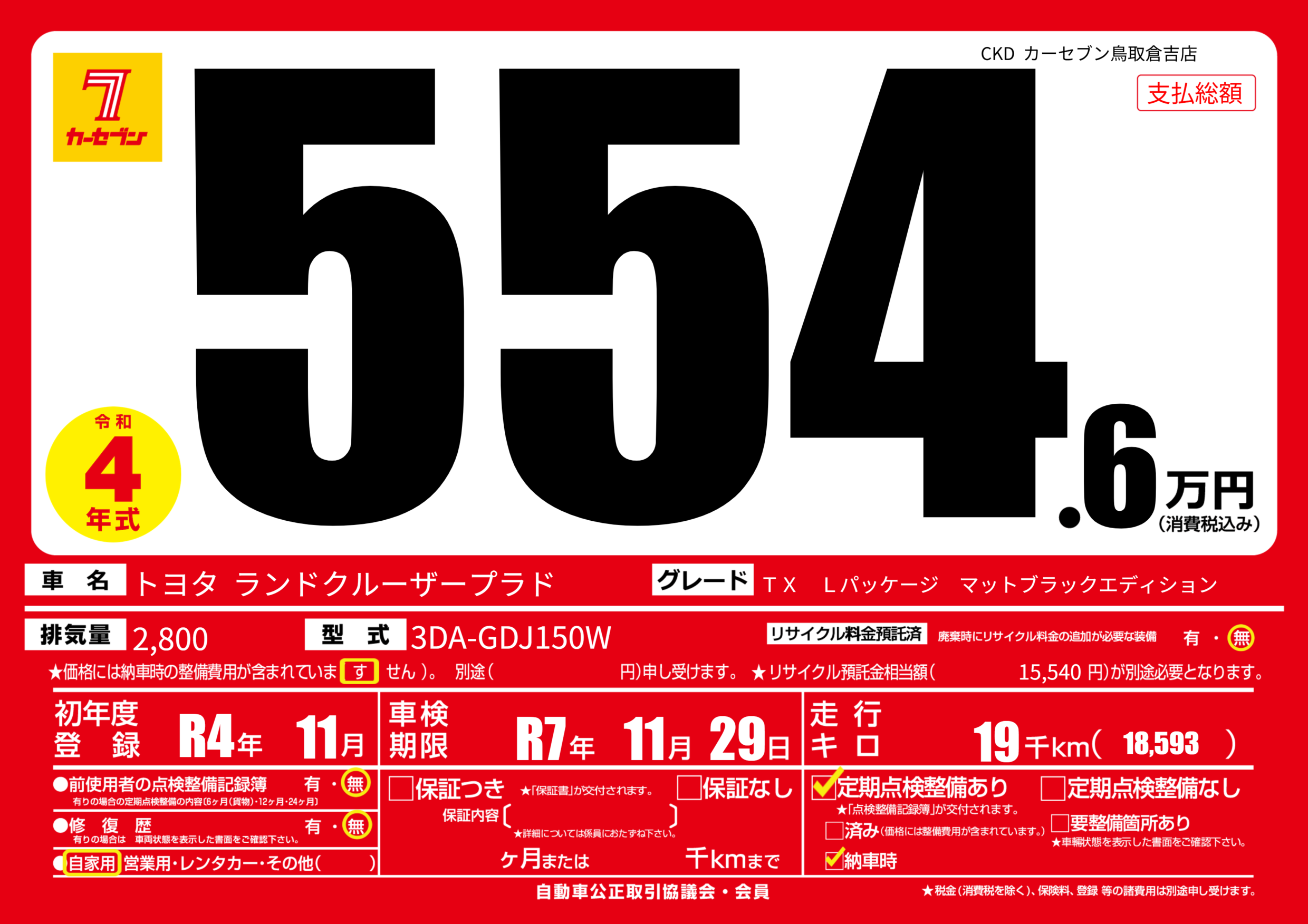 | 車名 | トヨタ ランドクルーザープラド | グレード ミッション 排気量 |
