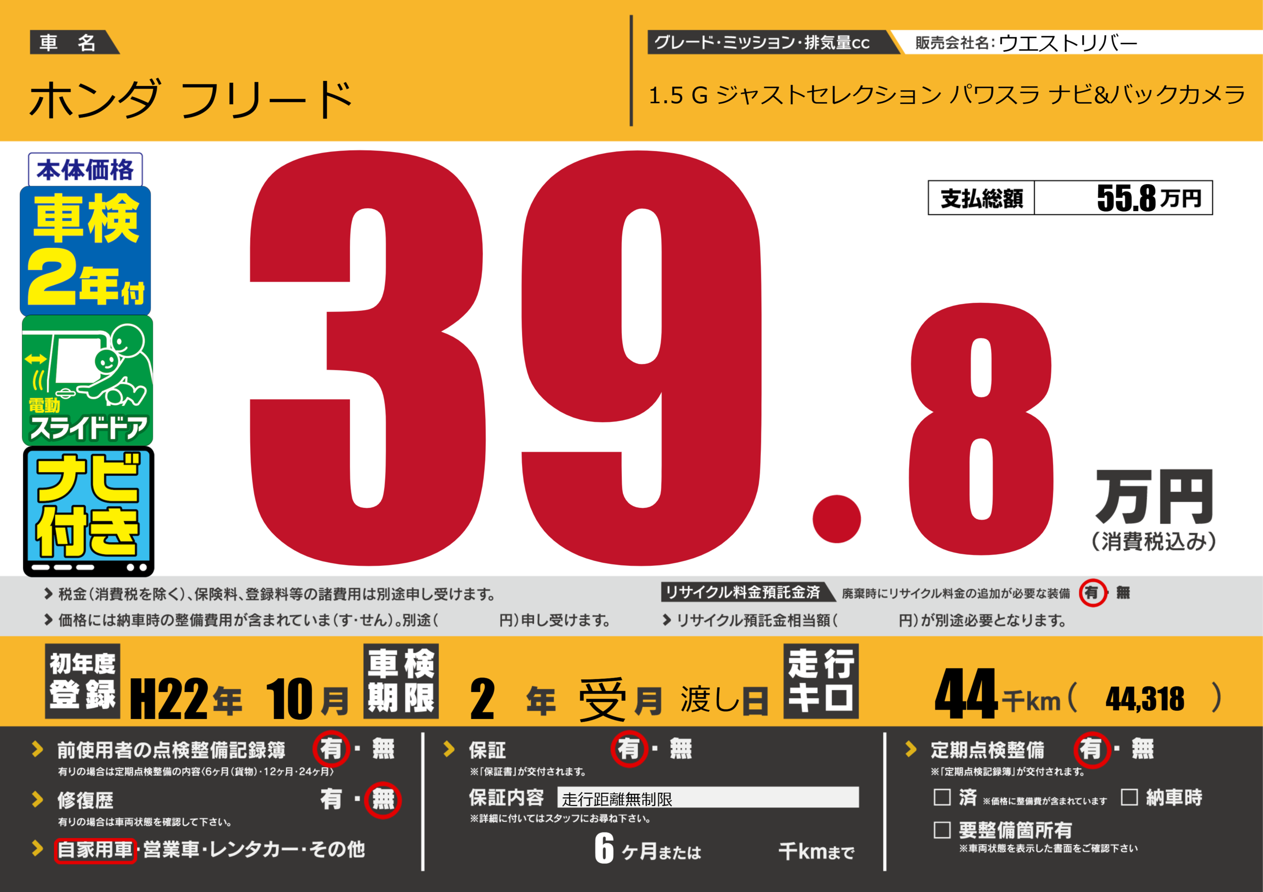 | 車名 | ホンダ フリード | グレード ミッション 排気量 |